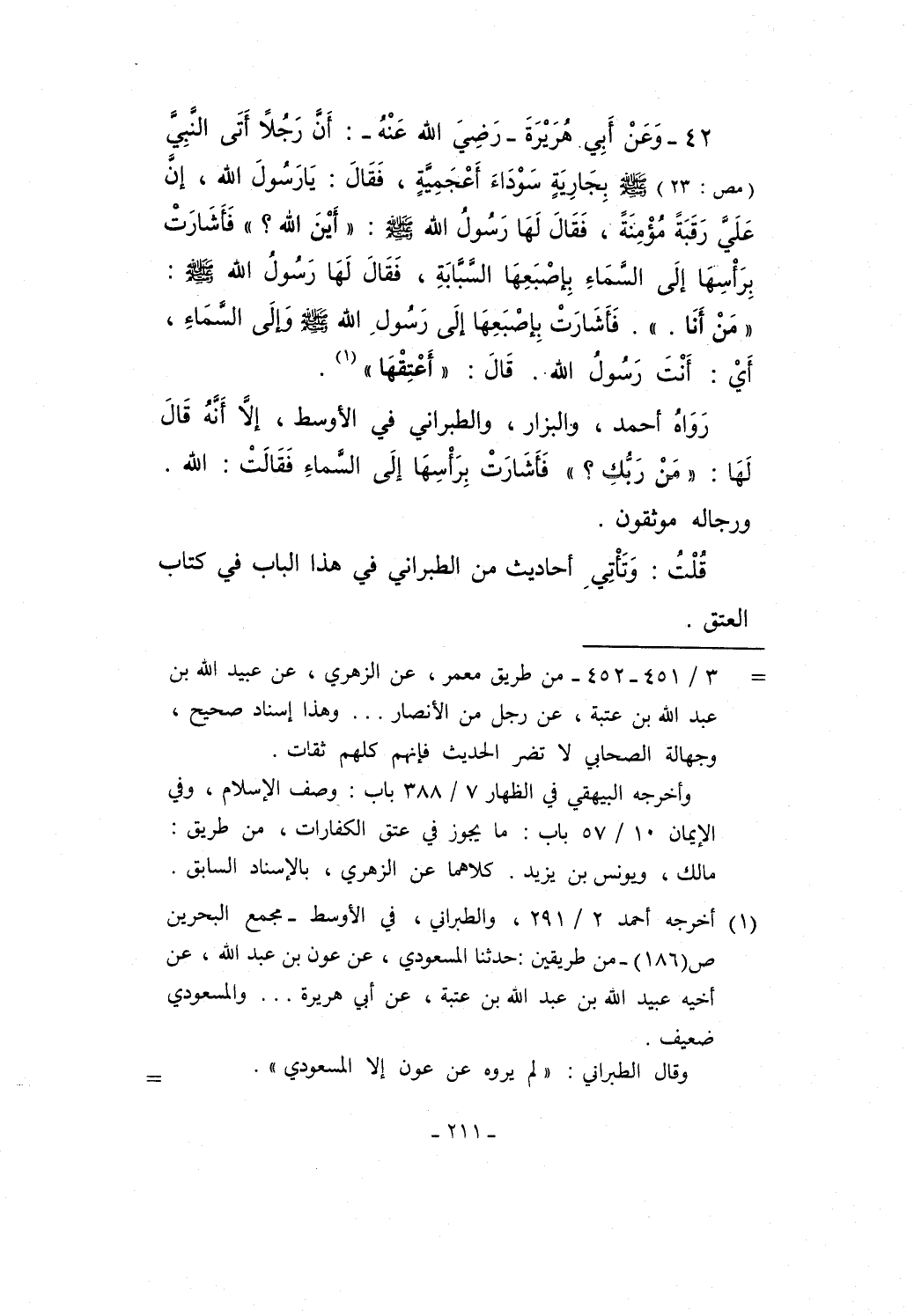 42 - وَعَنْ أَبِي هُرَيْرَةَ -رَضِيَ الله عَنْهُ-: أَنَّ رَجُلاً أَتَى النبِيَّ (مص: 23) - صلى الله عليه وسلم - بِجَارِيَةٍ سَوْدَاءَ أَعْجَمِيَّةٍ، فَقَالَ: يَا رَسُولَ الله، إنَّ عَلَيَّ رَقَبَةً مُؤْمِنَةً، فَقَالَ لَهَا رَسُولُ الله - صلى الله عليه وسلم -: "أَيْنَ الله؟ " فَأشَارَتْ بِرَأْسِهَا إلَى السَّمَاءِ بِإصْبَعِهَا السَّبَّابَةِ، فَقَالَ لَهَا رَسُولُ الله - صلى الله عليه وسلم -: "مَنْ أَنَا.". فَأَشَارَتْ بِإصْبَعِهَا إلَى رَسُولِ الله - صلى الله عليه وسلم - وَإلَى السَّمَاءِ، أَيْ: أَنْتَ رَسُولُ الله. قَالَ: "أَعْتِقْهَا" (¬1).