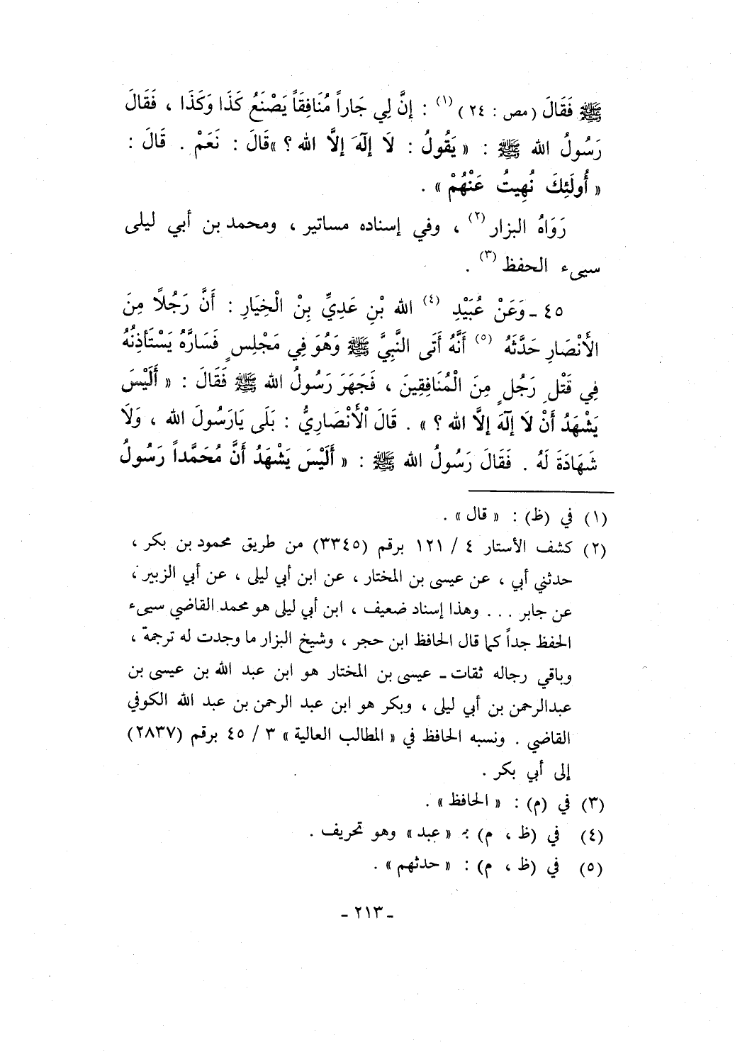 45 - وَعَنْ عُبَيْدِ (¬4) الله بْنِ عَدِيِّ بِنْ الْخِيَارِ: أَنَ رَجُلاً مِنَ الأنْصَارِ حَدَّثَهُ (¬5) أَنَّهُ أَتَى النَّبِي - صلى الله عليه وسلم - وَهُوَ فِي مَجْلِسٍ فَسَارَّهُ يَسْتَأذِنُهُ في قَتْلِ رَجُلٍ مِنَ الْمُنَافِقِينَ، فَجَهَرَ رَسُولُ الله - صلى الله عليه وسلم - فَقَال: "أَلَيسَ يَشْهَدُ أَنْ لاَ إِلَهَ إلَّا الله؟ ". قَالَ اْلأنْصَارِيُّ: بَلَى يَا رَسُولَ الله، وَلاَ شَهَادَةَ لَهُ. فَقَالَ رَسُولُ الله - صلى الله عليه وسلم -: "أَلَيْسَ يَشْهَدُ أَنً مُحَمَّداً رَسُولُ
