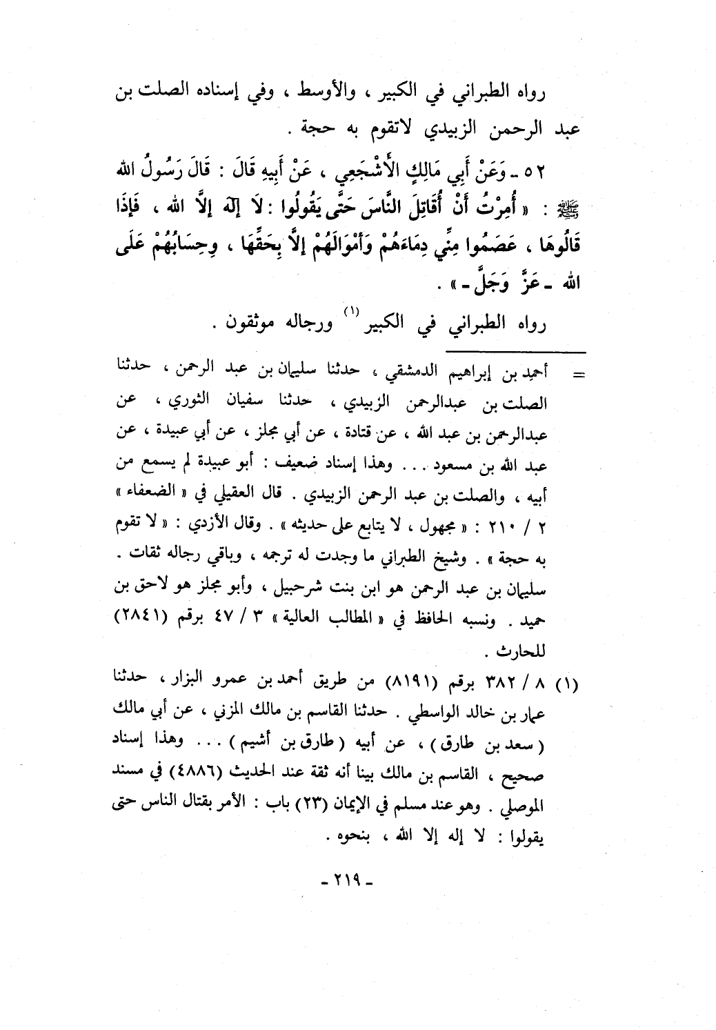 (¬1) 8/ 382 برقم (8191) من طريق أحمد بن عمرو البزار، حدثنا عمار بن خالد الواسطي. حدثنا القاسم بن مالك المزني، عن أبي مالك (سعد بن طارق)، عن أبيه (طارق بن أشيم) ... وهذا إسناد صحيح، القاسم بن مالك بينا أنه ثقة عند الحديث (4886) في مسند الموصلي. وهو عند مسلم في الإيمان (23) باب: الأمر بقتال الناس حتى يقولوا: لا إله إلا الله، بنحوه.