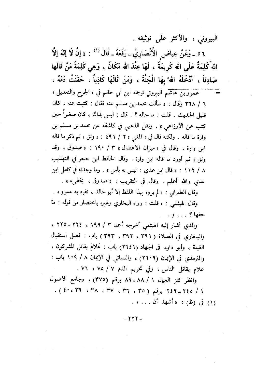 56 - وَعَنْ عِياضٍ الأنْصَارِيِّ -رَفَعَهُ- قَالَ (¬1): "إنَّ لاَ إِلَهَ إلاَّ الله كَلِمَةٌ عَلَى الله كَرِيمَةٌ، لَهَا عِنْدَ الله مَكَانٌ، وَهِي كَلِمَةٌ مَنْ قَالَهَا صَادِقاً، أَدْخَلَهُ اللهُ بِهَا الْجَنَّةَ، وَمَنْ قَالَهَا كاذِباً، حَقَنَتْ دَمَهُ،