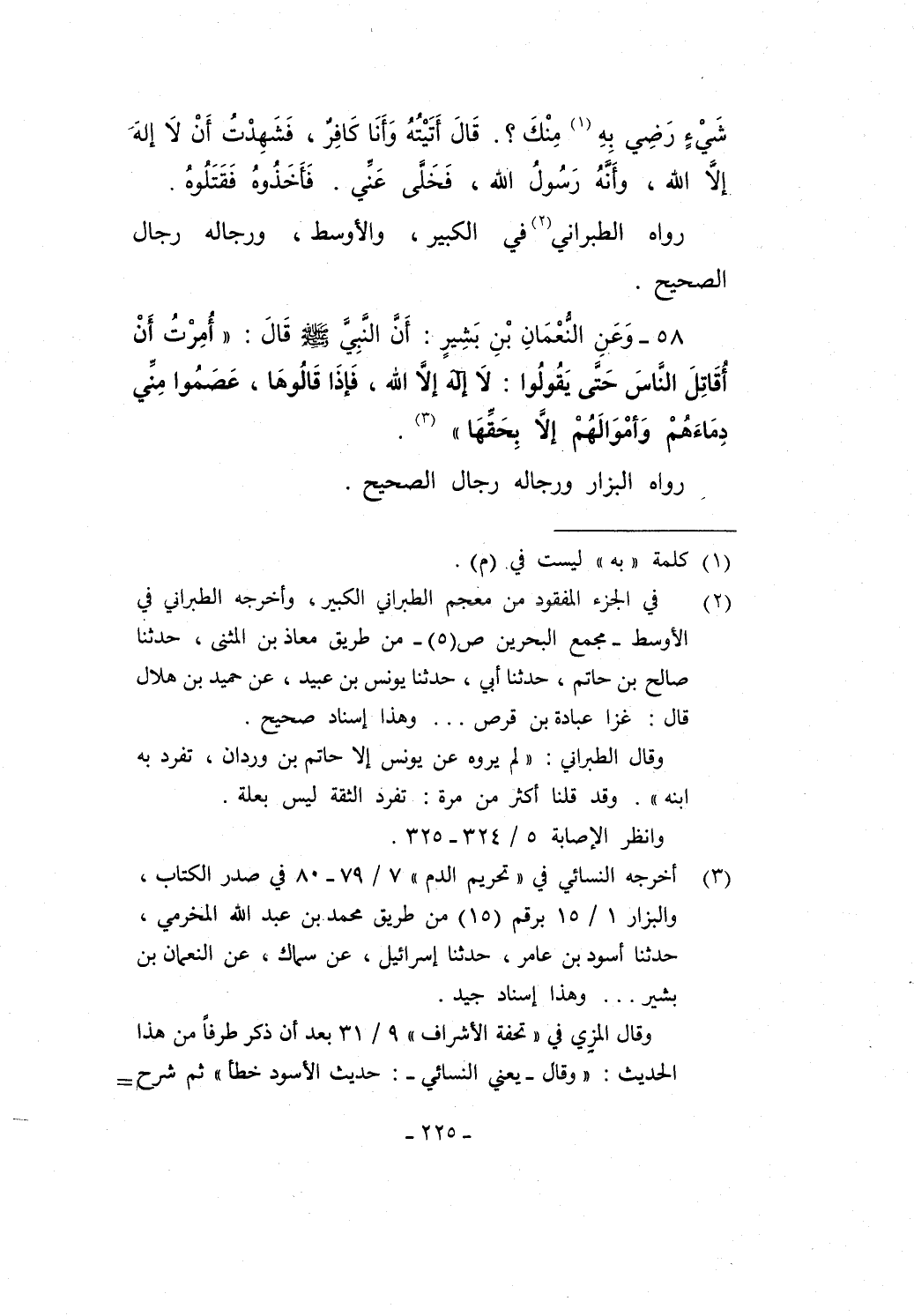 58 - وَعن النُّعْمَانِ بْنِ بَشِيرٍ: أَنَّ النَبِيَّ - صلى الله عليه وسلم - قَالَ: "أُمِرْتُ أَنْ أُقَاتِلَ النَّاسَ حَتَى يَقُولُوا: لاَ إِلَهَ إلاَّ الله، فَإذَا قَالُوهَا، عَصَمُوا مِنِّي دِمَاءَهُمْ وَأمْوَالَهُمْ إلاَّ بِحَقِّهَا" (¬3).
