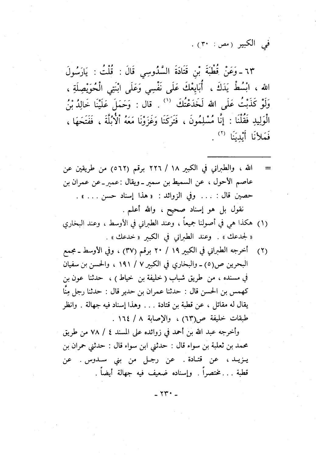 63 - وَعَنْ قُطْبَةَ بْنِ قَتَادَةَ السَّدُوسِي قَالَ: قُلْتُ: يَا رَسُولَ الله، ابْسُطْ يَدَكَ، أُبَايِعْكَ عَلَى نَفْسِي وَعَلَى ابْنَتِي الْحُويصِلَةِ، وَلَوْ كَذَبْتُ عَلَى الله لَخَدَعْتُكَ (¬1). قال: وَحَمَلَ عَلَيْنَا خَالِدُ بْنُ الْوَلِيدِ فَقلْنَا: إنَا مُسْلِمُونَ، فَتَرَكَنَا وَغَزَوْنَا مَعَهُ اْلأُبُلَّةَ، فَفَتَحَهَا، فَمَلأنَا أَيْدِيَنَا (¬2).