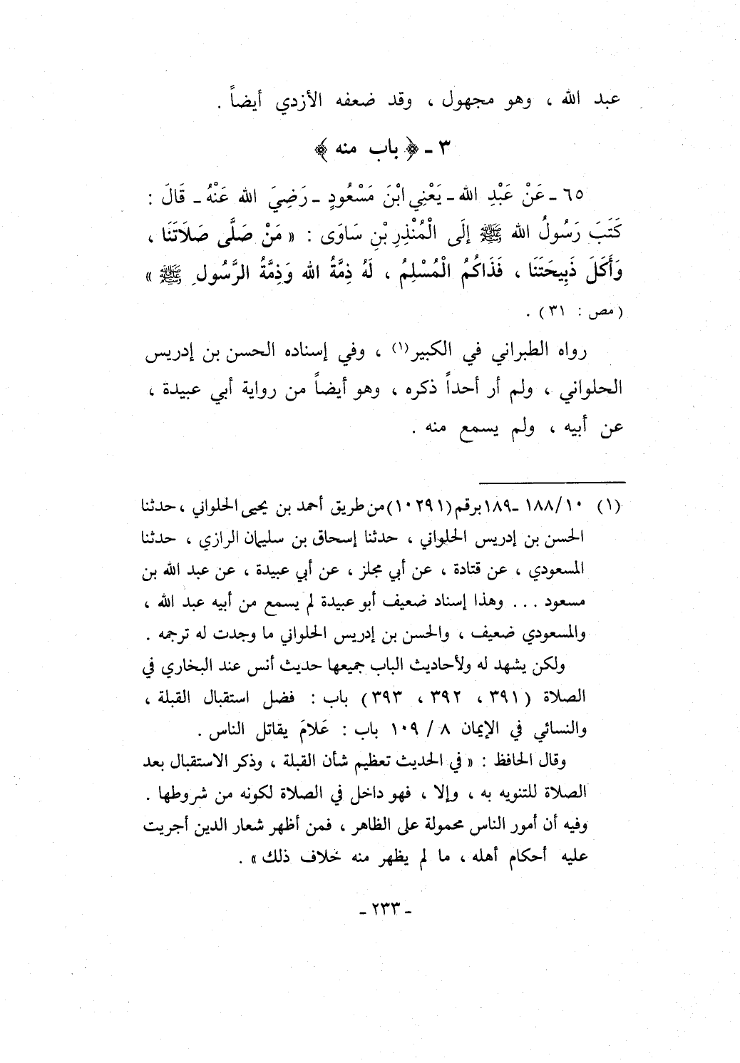65 - عَنْ عَبْدِ الله -يَعْنِي ابْنَ مَسْعُودٍ -رَضِيَ الله عَنْهُ- قَالَ: كَتَبَ رَسُولُ الله - صلى الله عليه وسلم - إلَى الْمُنْذِرِ بْنِ سَاوَى: "مَنْ صَلَّى صَلاَتَنَا، وَأَكَلَ ذَبِيحَتَنَا، فَذَاكُمُ الْمُسْلِمُ، لَهُ ذِمَّةُ الله وَذِمَّةُ الرَّسُولِ - صلى الله عليه وسلم -" (مص: 31).