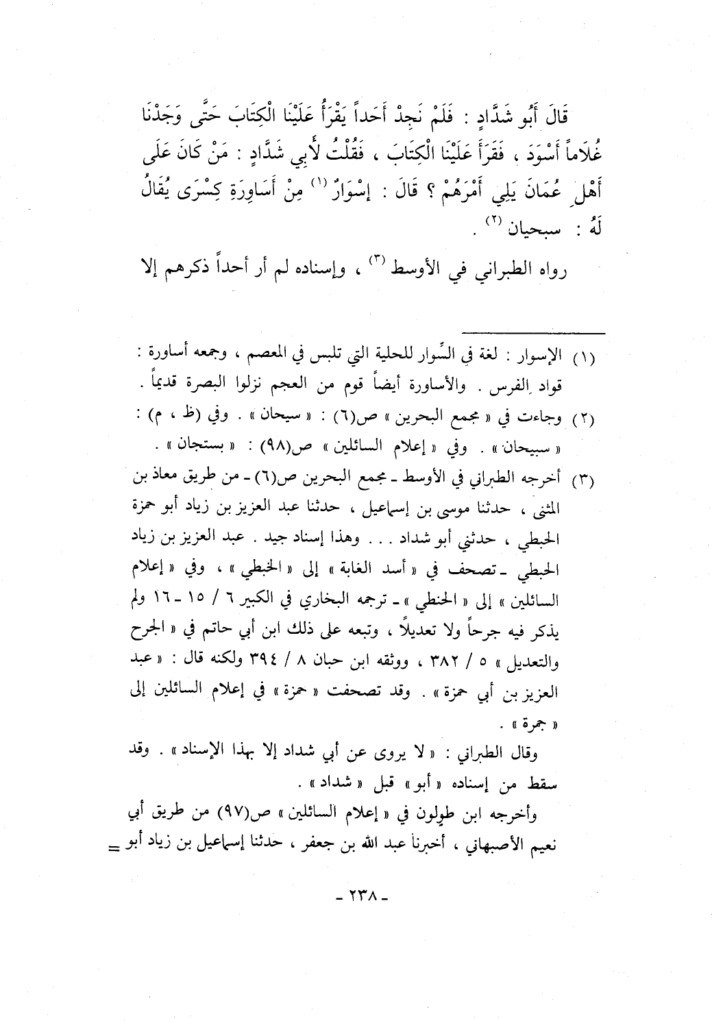 قَالَ أَبُو شَدَّادٍ: فَلَمْ نَجِدْ أَحَداً يَقْرَأُ عَلَيْنَا الْكِتَابَ حَتَى وَجَدْنَا غُلاَماً أَسْوَدَ، فَقَرَأَ عَلَيْنَا الْكِتَابَ، فَقُلْتُ لأبِي شَدَّادٍ: مَنْ كَانَ عَلَى أَهْلِ عُمَانَ يَلِي أَمْرَهُمْ؟ قَالَ: إسْوَارٌ (¬1) مِنْ أَسَاوِرَةِ كِسْرَى يُقَالُ لَهُ: سبحيان (¬2).