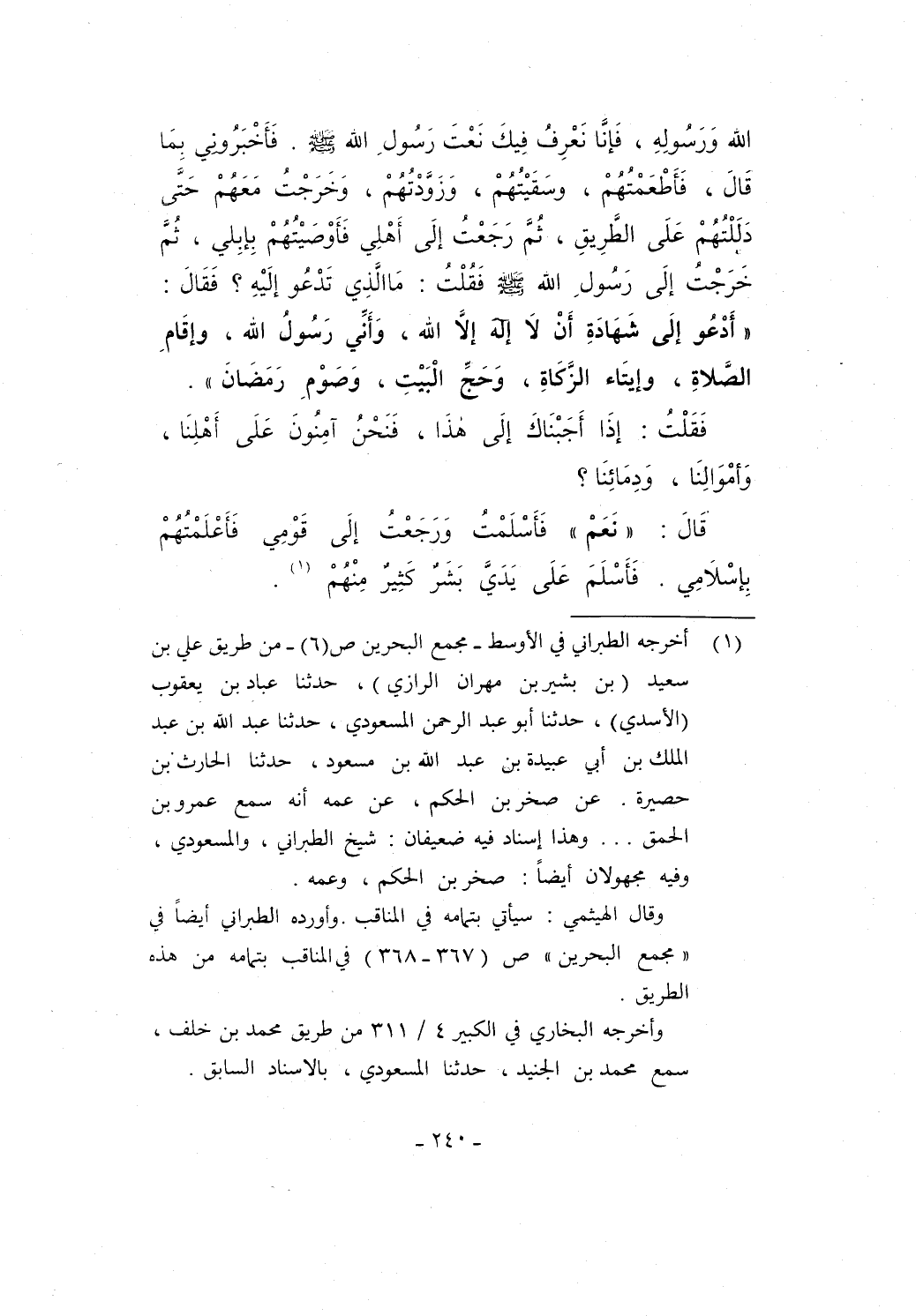 الله وَرَسُولِهِ، فَإنَّا نَعْرِفُ فِيكَ نَعْتَ رَسُولِ الله - صلى الله عليه وسلم -. فَأَخْبَرُونِي بِمَا قَالَ، فَأَطْعَمْتُهُمْ، وسَقَيْتُهُمْ، وَزَوَّدْتُهُمْ، وَخَرَجْتُ مَعَهُمْ حَتَّى دَلَلْتُهُمْ عَلَى الطَرِيقِ، ثُمَّ رَجَعْتُ إلَى أَهْلِي فَأَوْصَيْتُهُمْ بِإبِلي، ثُمَّ خَرَجْتُ إلَى رَسُولِ الله - صلى الله عليه وسلم - فَقُلْتُ: مَا الّذِي تَدْعُو إلَيْهِ؟ فَقَالَ: "أَدْعُو إلَى شهَادَةِ أَنْ لاَ إلَه إلاَّ الله، وَأَنِّي رَسُولُ الله، وإقَامِ الصَّلاةِ، وإيتَاء الزَّكَاةِ، وَحَجَ الْبَيْتِ، وَصوْمِ رَمَضَانَ".