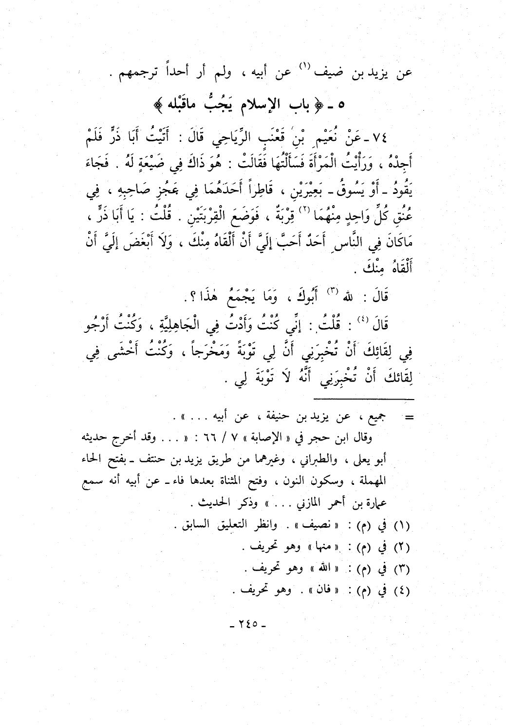 74 - عَنْ نُعَيْمِ بْنِ قَعْنَبٍ الرِّيَاحِي قَالَ: أَتَيْتُ أَبَا ذَرٍّ فَلَمْ أَجِدْهُ، وَرَأْيْتُ الْمَرْأَةَ فَسَأَلْتُهَا فَقَالَتْ: هُوَ ذَاكَ فِي ضَيْعَةٍ لَهُ. فَجَاءَ يَقُودُ -أَوْ يَسُوقُ- بَعِيْرَيْنِ، قَاطِراً أَحَدَهُمَا فِي عَجُزِ صَاحِبِهِ، فِي عُنُقِ كُلِّ وَاحِدٍ مِنْهُمَا (¬2) قِرْبَةٌ، فَوَضَعَ الْقِرْبَتَيْنِ. قُلْتُ: يَا أَبَا ذَرٍّ، مَا كَانَ فِي النَّاسِ أَحَدٌ أَحَبَّ إلَيَّ أَنْ أَلْقَاهُ مِنْكَ، وَلاَ أَبْغَضَ إلَيَّ أَنْ أَلْقَاه مِنْكَ.