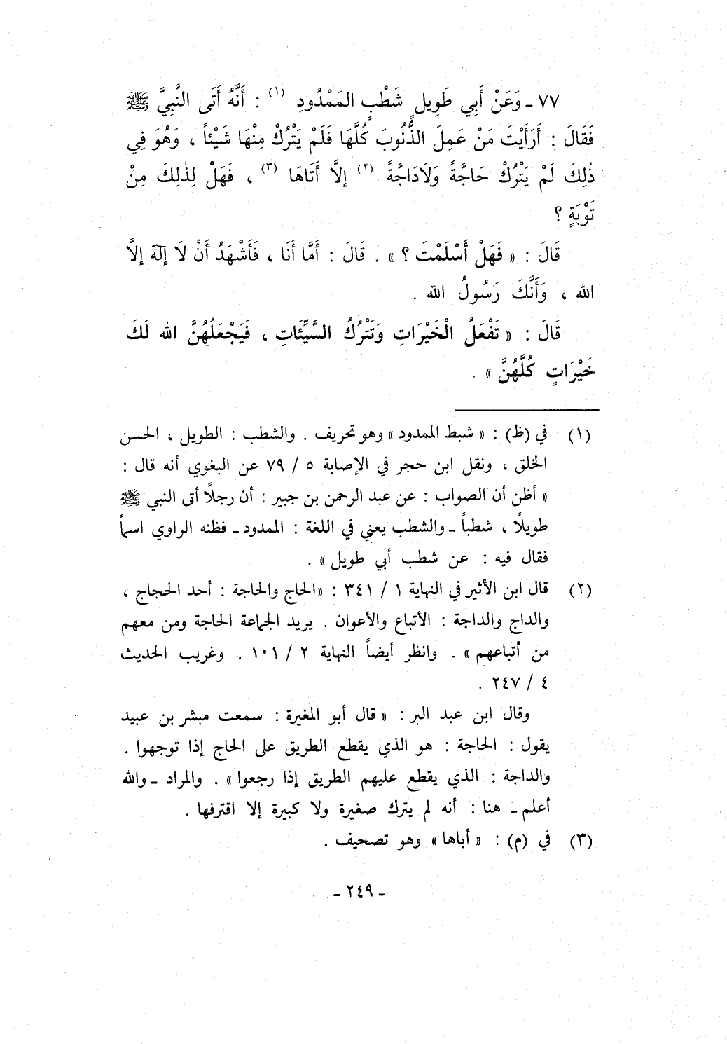 77 - وَعَنْ أَبِي طَوِيلٍ شَطْبِ المَمْدُودِ (¬1): أَنَّهُ أَتَى النَّبِي - صلى الله عليه وسلم - فَقَالَ: أَرَأَيْتَ مَنْ عَمِلَ الذنُوبَ كُلَّهَا فَلَمْ يَتْرُكْ مِنْهَا شَيْئاً، وَهُوَ فِي "ذلِكَ لَمْ يَتْرُكْ حَاجَّةً وَلاَ دَاجَّةً (¬2) إلاَّ أَتَاهَا (¬3)، فَهَلْ لِذَلِكَ مِنْ تَوْبَةٍ؟