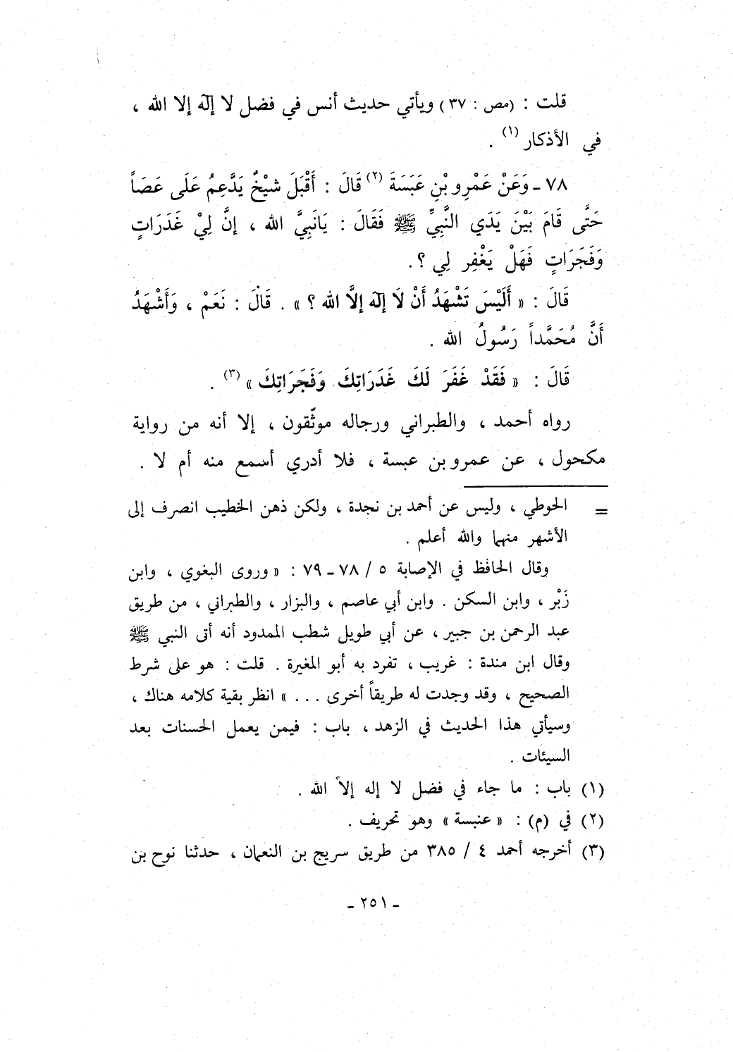 78 - وَعَنْ عَمْرِو بْنِ عَبَسَةَ (¬2) قَالَ: أَقْبَلَ شيْخٌ يَدَّعِمُ عَلَى عَصًا حَتَى قَامَ بَيْنَ يَدَي النَّبِيِّ - صلى الله عليه وسلم - فقَالَ: يَا نَبِيّ الله، إنَّ لِيْ غَدَرَاتٍ وَفَجَرَاتٍ فَهَلْ يَغْفِر لِي؟.