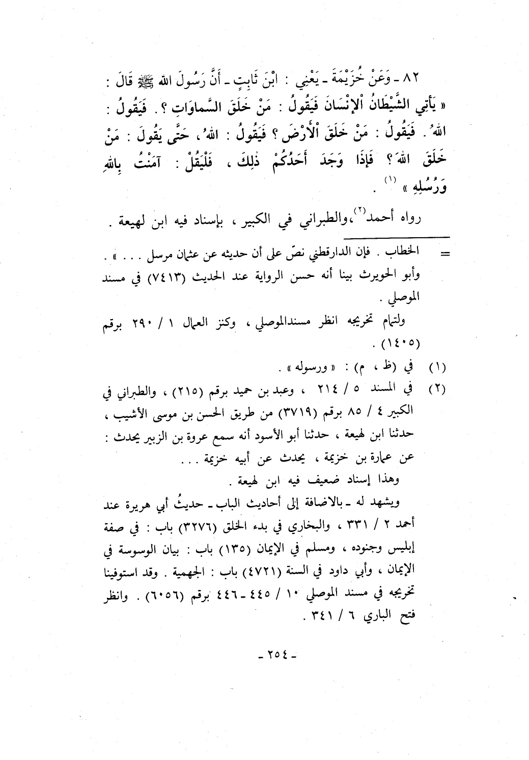82 - وَعَنْ خُزَيْمَةَ -يَعْنِي: ابْنَ ثَابِتٍ- أَنَّ رَسُولَ الله - صلى الله عليه وسلم - قَالَ: "يَأتِي الشَيْطَانُ اْلإنْسَانَ فَيَقُولُ: مَنْ خَلَقَ السَّمَاوَاتِ؟. فَيَقُولُ: اللهُ. فَيَقُولُ: مَنْ خَلَقَ اْلأَرْضَ؟ فَيَقُولُ: اللهُ، حَتَى يَقُولَ: مَنْ خَلَقَ اللهَ؟ فَإذَا وَجَدَ أَحَدُكُمْ ذلِكَ، فَلْيَقُلْ: آمَنْتُ باللهِ وَرُسُلِهِ" (¬1).