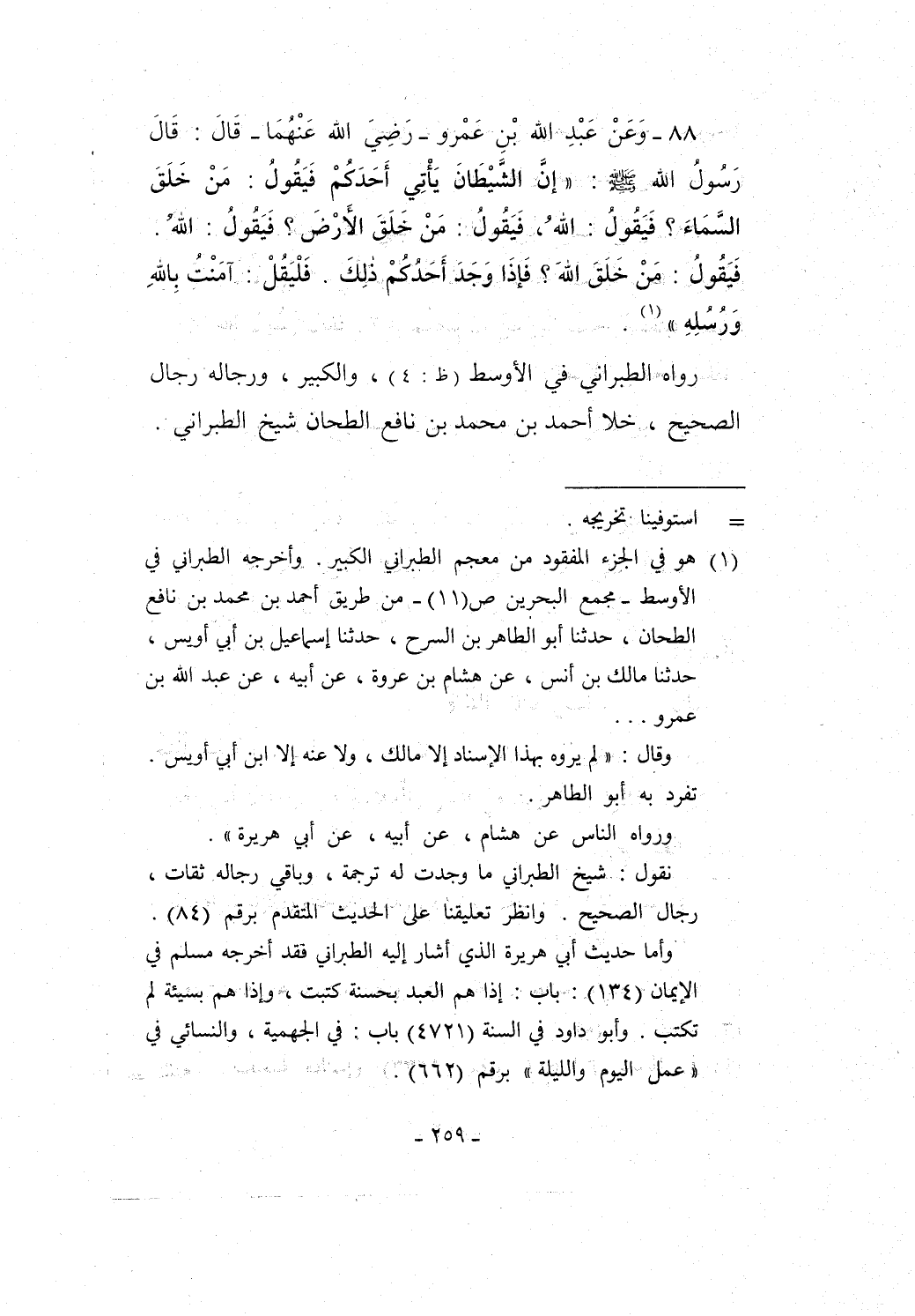 88 - وَعَنْ عَبْدِ الله بْنِ عَمْرو -رَضِيَ الله عَنْهُمَا- قَالَ: قَالَ رَسُولُ الله - صلى الله عليه وسلم -: "إنَّ الشَيْطَانَ يَأْتِي أَحَدَكُمْ فَيَقُولُ: مَنْ خَلَقَ السمَاءَ؟ فَيَقُولُ: اللهُ، فَيَقُولُ: مَنْ خَلَقَ الأَرْضَ؟ فَيَقُولُ: اللهُ.