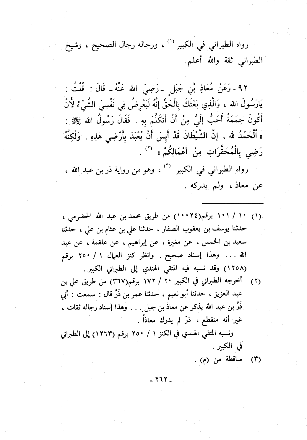 92 - وَعَنْ مُعَاذِ بْنِ جَبَلٍ -رَضِيَ الله عَنْهُ- قَالَ: قُلْتُ: يَا رَسُولَ الله، وَالَّذِي بَعَثَكَ بِالْحَقِّ إنَّهُ لَيَعْرِضُ فِي نَفْسِيَ الشَّيْءُ لأنْ أَكُونَ حِمَمَةً أَحَبُّ إلَيَّ مِنْ أَنْ أَتَكَلَّمَ بِهِ. فَقَالَ رَسُولُ الله - صلى الله عليه وسلم -: "اْلْحَمْدُ لله، إنَّ الشَّيْطَانَ قَدْ أَيِسَ أَنْ يُعْبَدَ بِأَرْضِي هذِهِ. وَلكِنَّهُ رَضِي بِالْمُحَقَّرَاتِ مِنْ أَعْمَالِكُمْ" (¬2).