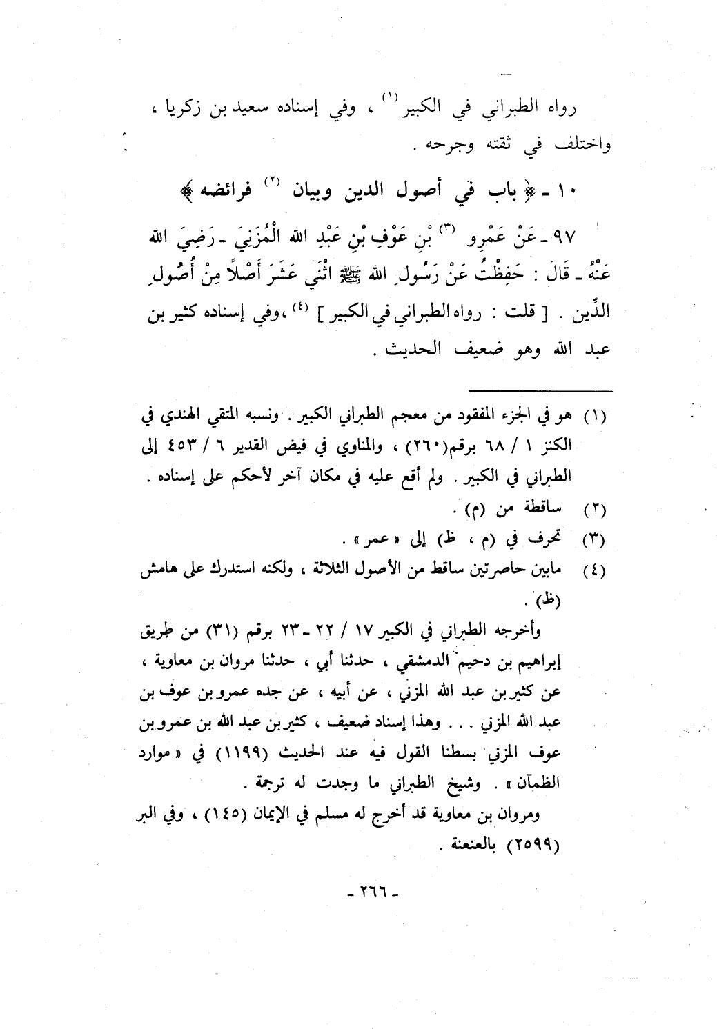 97 - عَنْ عَمْرِو (¬3) بْنِ عَوْفِ بْنِ عَبْدِ الله الْمُزَنِيَ -رَضِيَ الله عَنْهُ- قَالَ: حَفِظْتُ عَنْ رَسُولِ الله - صلى الله عليه وسلم - اثْنَي عَشَرَ أَصْلاً مِنْ أُصُولِ الدِّين. [قلت: رواه الطبراني في الكبير] (¬4)، وفي إسناده كثير بن عبد الله وهو ضعيف الحديث.