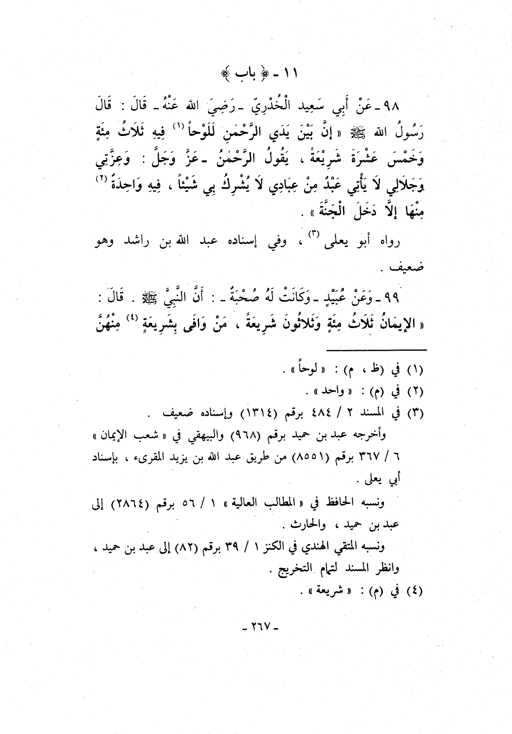 98 - عَنْ أَبِي سَعِيد الْخُدْرِيّ -رَضيَ الله عَنْهُ- قَالَ: قَالَ رَسُولُ الله - صلى الله عليه وسلم - "إنَّ بَيْنَ يَدَي الرَّحْمنِ لَلَوْحاً (¬1) فِيهِ ثَلاَثُ مِئَةٍ وَخَمْسَ عَشْرَةَ شَرِيْعَةً، يَقُولُ الرَّحْمَنُ -عَزَّ وَجَلَّ: وَعِزَّتِي وَجَلاَلِي لاَ يَأْتِي عَبْدٌ مِنْ عِبَادي لاَ يُشْرِكُ بِي شَيْئاً، فِيهِ وَاحِدَةٌ (¬2) مِنْهَا إلاَّ دَخَلَ الْجَنَّةَ".