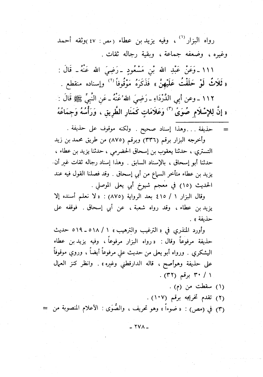 111 - وَعَنْ عَبْدِ الله بْنِ مَسْعُودٍ -رَضِيَ الله عَنْهُ- قَالَ: "ثَلاَثٌ لَوْ حَلَفْتُ عَلَيْهِن" فَذَكَرَهُ مَوْقُوفاً (¬2) وإسناده منقطع.
