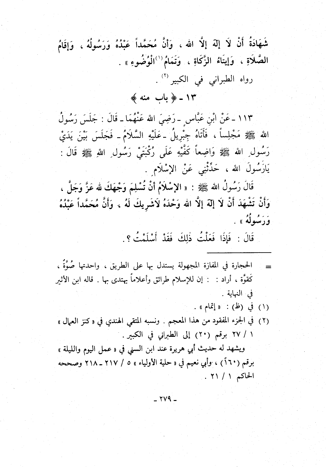 113 - عَنْ ابْنِ عَبَّاسٍ -رَضِيَ الله عَنْهُمَا- قَالَ: جَلَسَ رَسُولُ الله - صلى الله عليه وسلم - مَجْلِساً، فَأَتَاهُ جِبْرِيلُ -عَلَيْهِ السَّلاَمُ- فَجَلَسَ بَيْنَ يَدَيْ رَسُولِ الله - صلى الله عليه وسلم - واضِعاً كَفَّيْهِ عَلَى رُكْبَتَيْ رَسُولِ اللهِ - صلى الله عليه وسلم - قَالَ: يَا رَسُولَ الله، حَدِّثْنِي عَنْ الإسْلاَمِ.