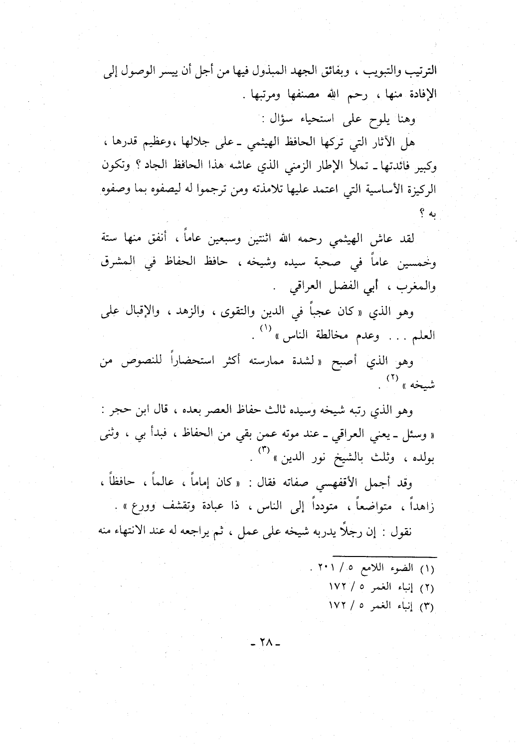 لقد عاش الهيثمي رحمه الله اثنتين وسبعين عاماً، أنفق منها ستة وخمسين عاماً في صحبة سيده وشيخه، حافظ الحفاظ في المشرق والمغرب، أبي الفضل العراقي.