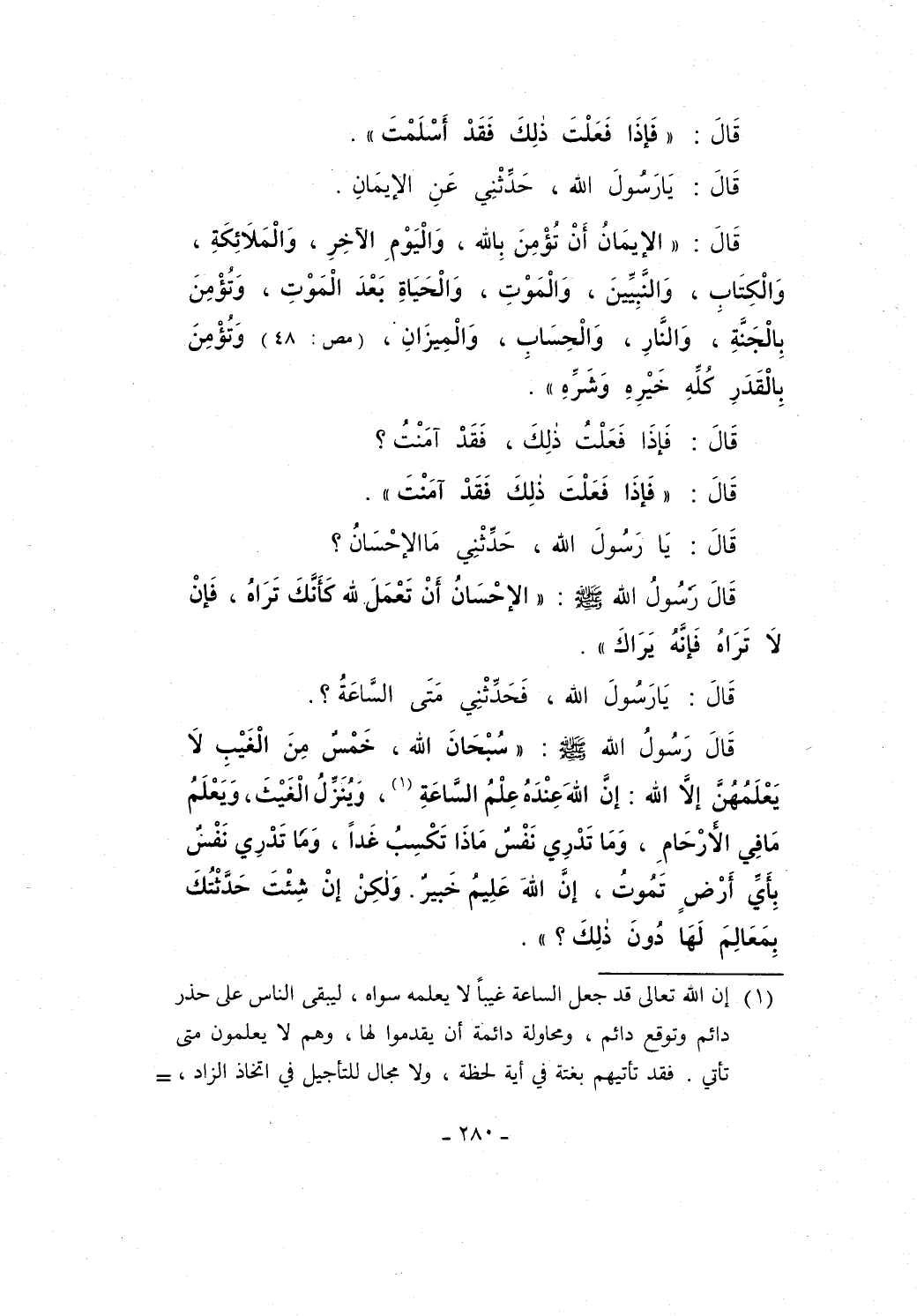 قَالَ رَسُولُ الله - صلى الله عليه وسلم -: "سُبْحَانَ الله، خَمْسٌ مِنَ الْغَيْبِ لاَ يَعْلَمُهُن إلاَّ الله: إنَّ الله عِنْدَهُ عِلْمُ السَّاعَةِ (¬1)، وَيُنَزِّلُ الْغَيْثَ، وَيَعْلَمُ مَا فِي الأرْحَامِ، وَمَا تَدْرِي نَفْسٌ مَاذَا تَكْسِبُ غَداً، وَمَا تَدْرِي نَفْسٌ بِأَيِّ أَرْضٍ تَمُوتُ، إن الله عَلِيمُ خَبيرٌ. وَلكِنْ إنْ شِئْتَ حَدَّثْتُكَ بِمَعَالِمَ لَهَا دونَ ذلِكَ؟ ".