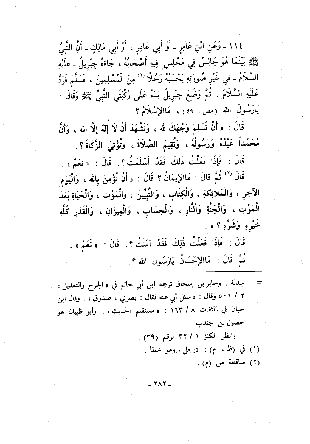 114 - وَعَنِ ابْنِ عَامِرٍ -أَوْ أَبِي عَامِرٍ، أَوْ أَبِي مَالِكٍ -أَنَّ النَّبِي - صلى الله عليه وسلم - بيْنَمَا هُوَ جَالِسٌ فِي مَجْلِسٍ فِيهِ أَصْحَابُهُ، جَاءَهُ جِبْرِيلُ -عَلَيْهِ السَّلاَمُ- فِي غَيْرِ صُورَتِهِ يَحْسَبُهُ رَجُلاً (¬1) مِنَ الْمُسْلِمِينَ، فَسَلَّمَ فَرَدَّ عَلَيْهِ السَّلامَ. ثُمَّ وَضَعَ جِبْرِيلُ يَدَهُ عَلَى رُكْبَتَي النبِيِّ - صلى الله عليه وسلم - وَقَالَ: يَا رَسُولَ الله (مص: 49)، مَا الإسْلاَمُ؟