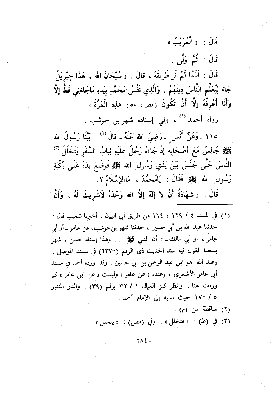 115 - وَعَن أَنَسٍ -رَضِيَ الله عَنْهُ- قَالَ (¬2): بَيْنَا رَسُولُ الله - صلى الله عليه وسلم - جَالِسٌ مَع أَصْحَابِهِ إذْ جَاءَهُ رَجُلٌ عَلَيْهِ ثِيَابُ السَّفَرِ يَتَخَلَّلُ (¬3) النَّاسَ حَتى جَلَسَ بَيْنَ يَدَي رَسُولِ الله - صلى الله عليه وسلم - فَوَضَعَ يَدَهُ عَلَى رُكْبَةِ رَسُولِ الله - صلى الله عليه وسلم - فَقَالَ: يَا مُحَمَّدُ، مَا الإسْلاَمُ؟.