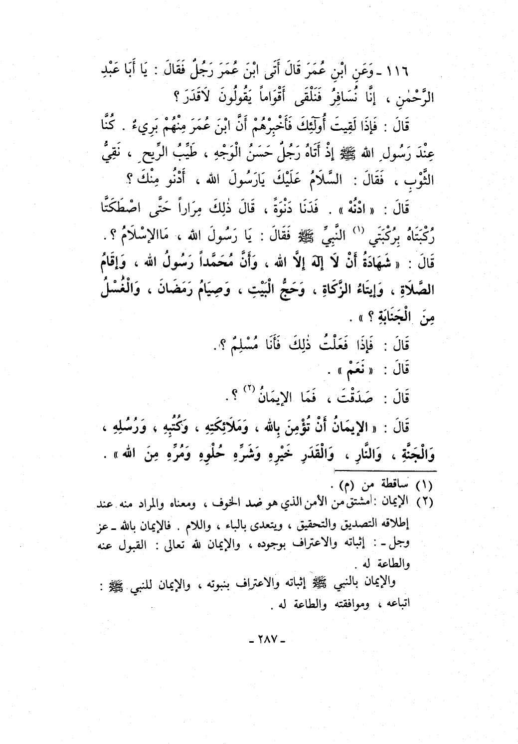 قَالَ: فَإذَا لَقِيتَ أُولئكَ فَأَخْبِرْهُمْ أَنَّ ابْنَ عُمَرَ مِنْهُمْ بَرِيءٌ. كُنَّا عِنْدَ رَسُولِ الله - صلى الله عليه وسلم - إذْ أَتَاهُ رَجُلٌ حَسَنُ الْوَجْهِ، طَيِّبُ الرِّيحِ، نَقِيُّ الثَّوْبِ، فَقَالَ: السَّلاَمُ عَلَيْكَ يَا رَسُولَ الله، أَدْنُو مِنْكَ؟