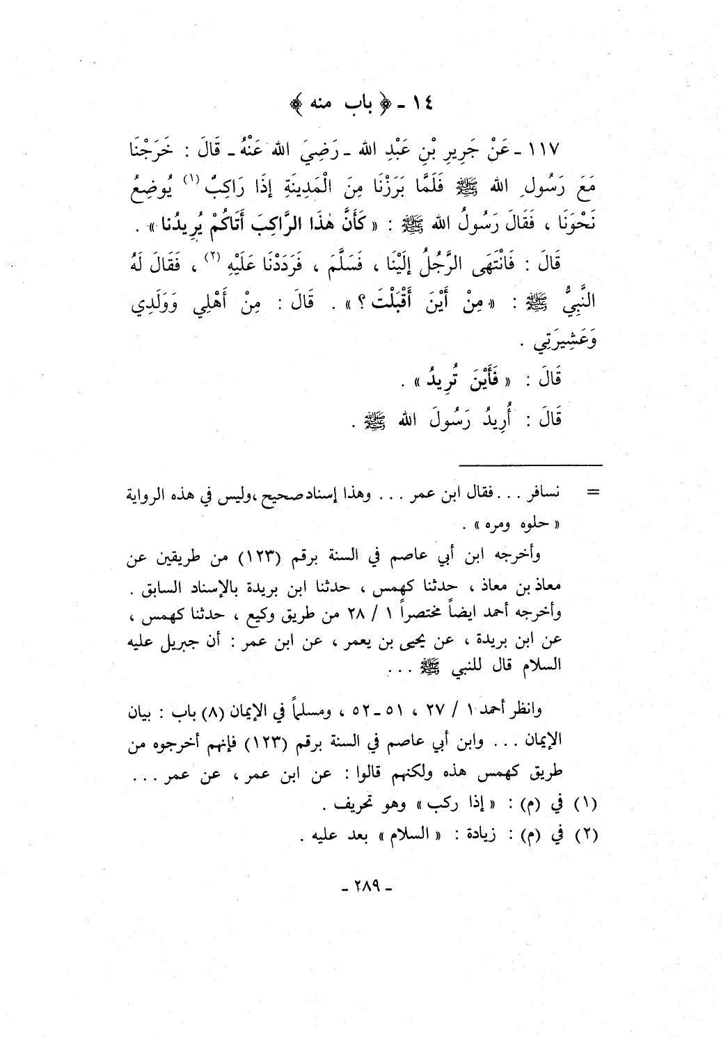 117 - عَنْ جَرِيرِ بْنِ عَبْدِ الله -رَضِيَ الله- عَنْهُ- قَالَ: خَرَجْنَا مَعَ رَسُولِ الله - صلى الله عليه وسلم - فَلَمَّا بَرَزْنَا مِنَ الْمَدِينَةِ إذَا رَاكِبٌ (¬1) يُوضِعُ نَحْوَنَا، فَقَالَ رَسُولُ الله - صلى الله عليه وسلم -: "كَأَنَّ هذَا الرَّاكِبَ أَتَاكُمْ يُرِيدُنا".