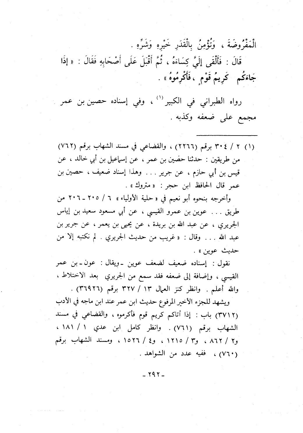 (¬1) 2/ 304 برقم (2266)، والقضاعي في مسند الشهاب برقم (762) من طريقين: حدثنا حصين بن عمر، عن إسماعيل بن أبي خالد، عن قيس بن أبي حازم، عن جرير ... وهذا إسناد ضعيف، حصين بن عمر قال الحافظ ابن حجر: "متروك".