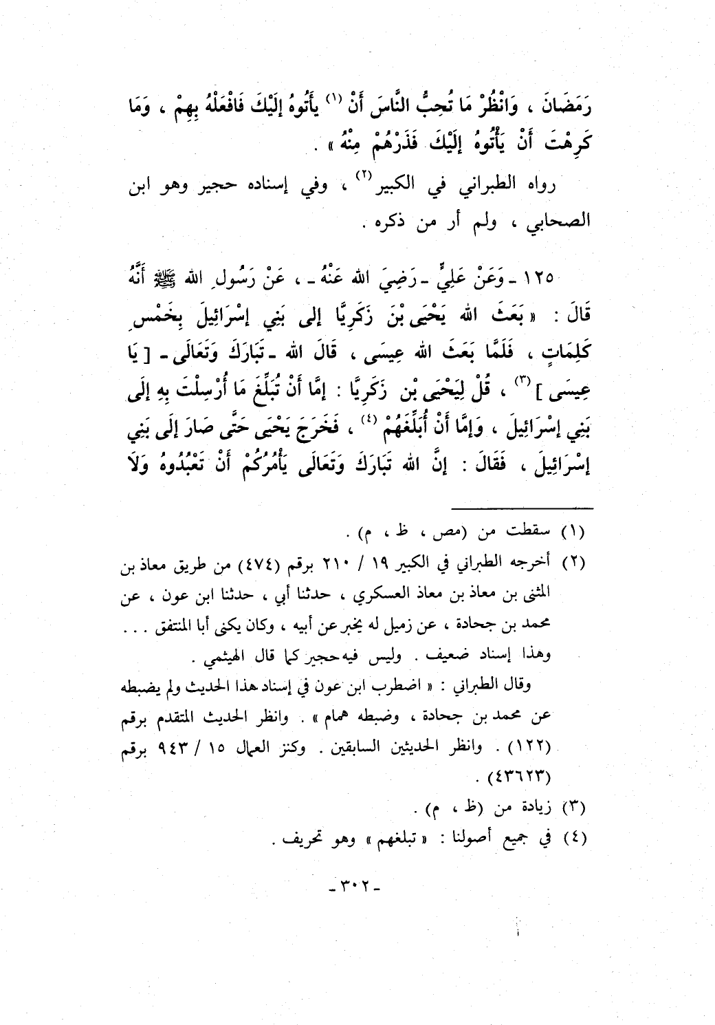 وقال الطبراني: "اضطرب ابن عون في إسناد هذا الحديث ولم يضبطه عن محمد بن جحادة، وضبطه همام". وانظر الحديث المتقدم برقم (122). وانظر الحديثين السابقين. وكنز العمال 15/ 943 برقم (43623).