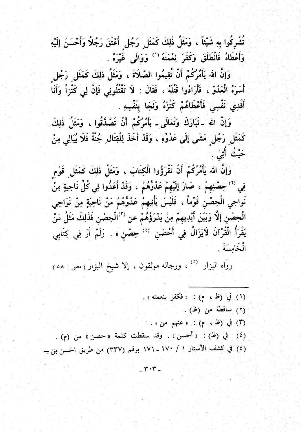 وَإنَّ الله يَأمُرُكمْ أَنْ تَقْرَؤُوا الْكِتَابَ، وَمَثَلُ ذَلِكَ كمَثَلِ قَوْمٍ في (¬2) حِصْنِهِمْ، صَارَ إلَيْهِمْ عَدُوُّهُمْ، وَقَدْ أَعَدُّوا في كلِّ نَاحِيةٍ مِنْ نَواحِي الْحِصْنِ قَوْماً، فَلَيسَ يَأْتِيهِمْ عَدُوُّهُمْ مَن نَاحِيَةٍ مِنْ نَوَاحِي الْحِصْنِ إلاَّ وَبَيْنَ أَيْدِيهِمْ مِنْ يَدْرَؤُهُمْ عن (¬3) الْحِصْنِ فَذلِكَ مَثَلُ مَنْ يَقْرَأُ الْقُرْآنَ لاَ يَزَالُ في أَحْصَنِ (¬4) حِصْنٍ". وَلَمْ أَرَ في كِتَابِي الخَامِسَةَ.
