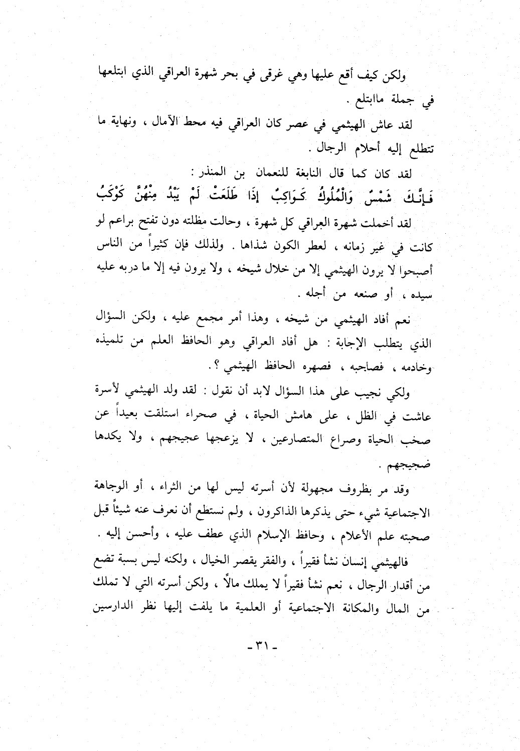 فالهيثمي إنسان نشأ فقيراً، والفقر يقصر الخيال، ولكنه ليس بسبة تضع من أقدار الرجال، نعم نشأ فقيراً لا يملك مالاً، ولكن أسرته التي لا تملك من المال والمكانة الاجتماعية أو العلمية ما يلفت إليها نظر الدارسين
