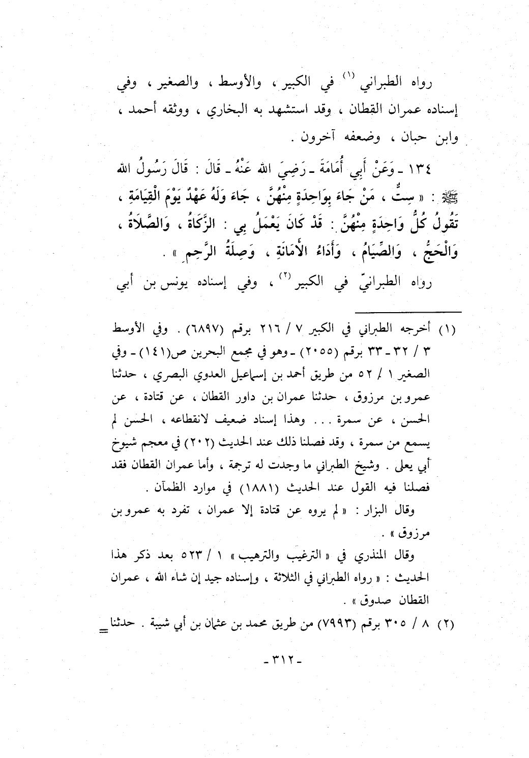 134 - وَعَنْ أَبِي أُمَامَةَ -رَضِيَ الله عَنْهُ- قَالَ: قَالَ رَسُولُ الله - صلى الله عليه وسلم -: "سِتٌّ، مَنْ جَاءَ بِوَاحِدَةٍ مِنْهُنَّ، جَاءَ وَلَهُ عَهْدٌ يَوْمَ الْقِيَامَةِ، تَقُولُ كُلُّ وَاحِدَةٍ مِنْهُنَّ: قَدْ كَانَ يَعْمَلُ بِي: الزَّكَاةُ، وَالصَّلاَةُ، وَالْحَجُّ، وَالصِّيَامُ، وَأَدَاءُ الَأمَانَةِ، وَصِلَةُ الرَّحِمِ".