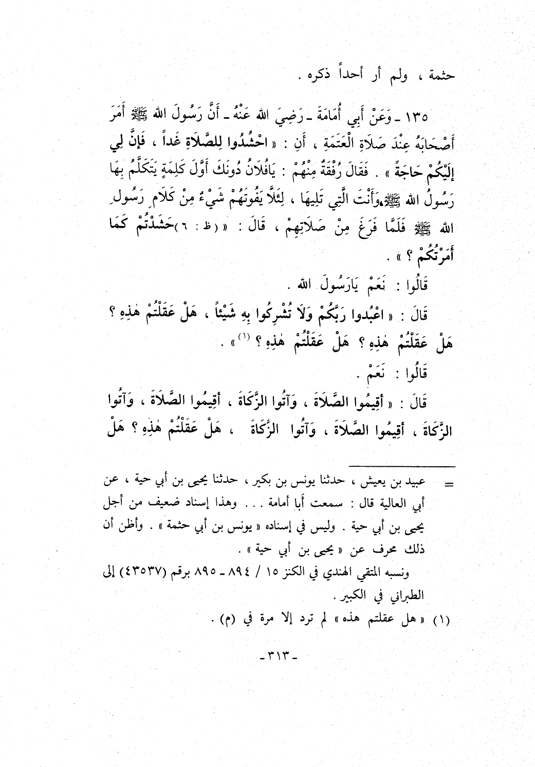 135 - وَعَنْ أَبِي أُمَامَةَ -رَضِيَ الله عَنْهُ- أَنَّ رَسُولَ الله - صلى الله عليه وسلم - أَمَرَ أَصْحَابَهُ عِنْدَ صَلاَةِ الْعَتَمَةِ، أَنِ: "احْشُدُوا لِلصَّلاَةِ غَداً، فَإنَّ لِي إلَيْكُمْ حَاجَةً". فَقَالَ رُفْقَةٌ مِنْهُمْ: يَا فُلاَنُ دُونَكَ أَوَّلَ كَلِمَةٍ يَتَكَلَّمُ بِهَا رَسُولُ الله - صلى الله عليه وسلم -، وَأَنْتَ الَّتِي تَلِيهَا، لِئَلاَّ يَفُوتَهُمْ شَيْءٌ مِنْ كَلاَمِ رَسُولِ الله - صلى الله عليه وسلم - فَلَمَّا فَرَغَ مِنْ صَلاَتِهِمْ، قَالَ: " (ظ: 6) حَشَدتُمْ كَمَا أَمرْتُكُمْ؟ ".