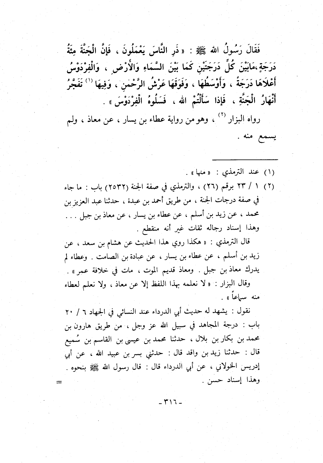 (¬2) 1/ 23 برقم (26)، والترمذي في صفة الجنة (2532) باب: ما جاء في صفة درجات الجنة، من طريق أحمد بن عبدة، حدثنا عبد العزيز بن محمد، عن زيد بن أسلم، عن عطاء بن يسار، عن معاذ بن جبل ... وهذا إسناد رجاله ثقات غير أنه منقطع.