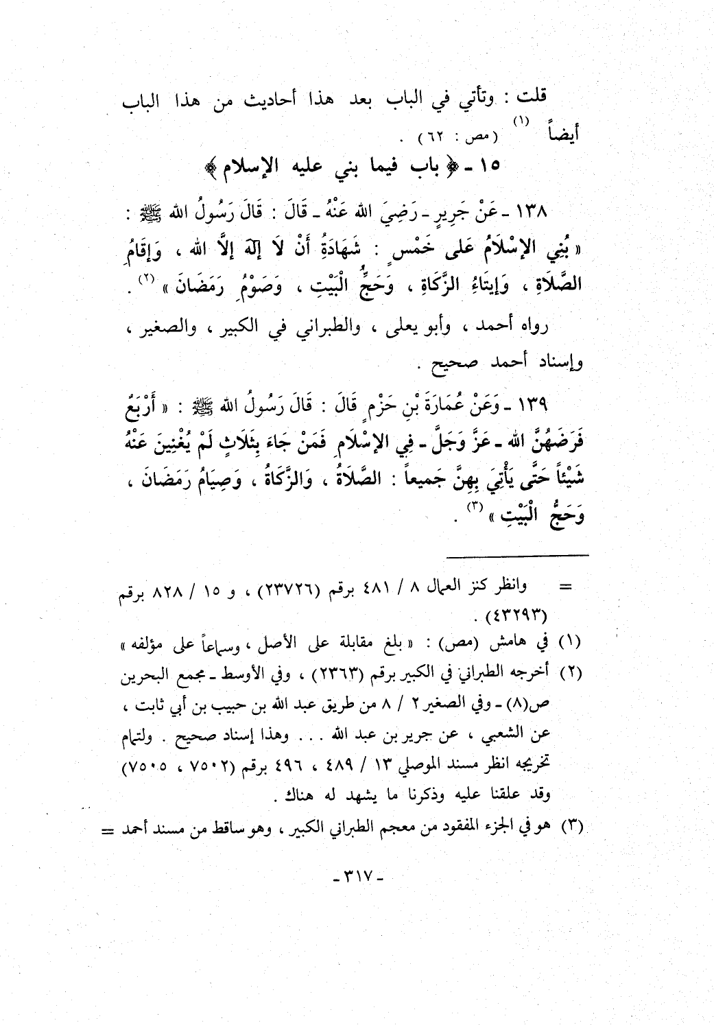 138 - عَنْ جَرِيرٍ -رَضِيَ الله عَنْهُ- قَالَ: قَالَ رَسُولُ الله - صلى الله عليه وسلم -: "بُنِي الإسْلاَمُ عَلى خَمْسٍ: شَهَادَة أَنْ لاَ إِلَهَ إلاَّ الله، وَإقَامُ الصَّلاَةِ، وَإيتَاءُ الزَّكَاةِ، وَحَج الْبَيْتِ، وَصَوْمُ رَمَضَانَ" (¬2).