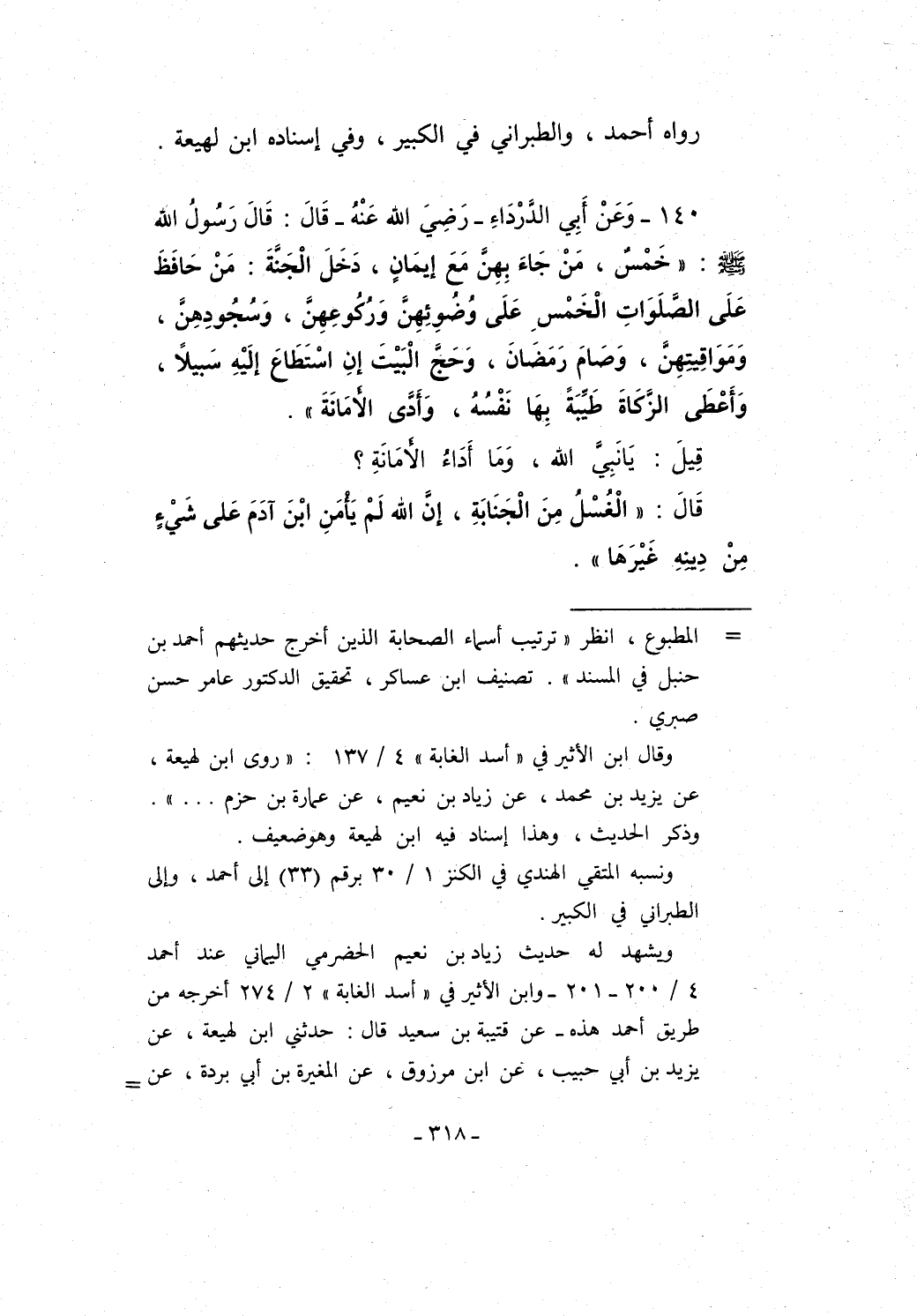 140 - وَعَنْ أَبِي الدَّرْدَاءِ -رَضِيَ الله عَنْهُ- قَالَ: قَالَ رَسُولُ الله - صلى الله عليه وسلم -: "خَمْسٌ، مَنْ جَاءَ بِهِنَّ مَع إيمَانٍ، دَخَلَ الْجَنَّةَ: مَنْ حَافَظَ عَلَى الصَّلَوَاتِ الْخَمْسِ عَلَى وُضوئِهِن وَرُكُوعِهِنَّ، وَسُجُودِهِنَّ، وَمَوَاقِيتِهِنَّ، وَصَامَ رَمَضَانَ، وَحَجَّ الْبَيْتَ إنِ اسْتَطَاعَ إلَيْهِ سَبيلاً، وَأَعْطَى الزَّكَاةَ طَيِّبَةً بِهَا نَفْسُهُ، وَأَدَّى الأمَانَةَ".
