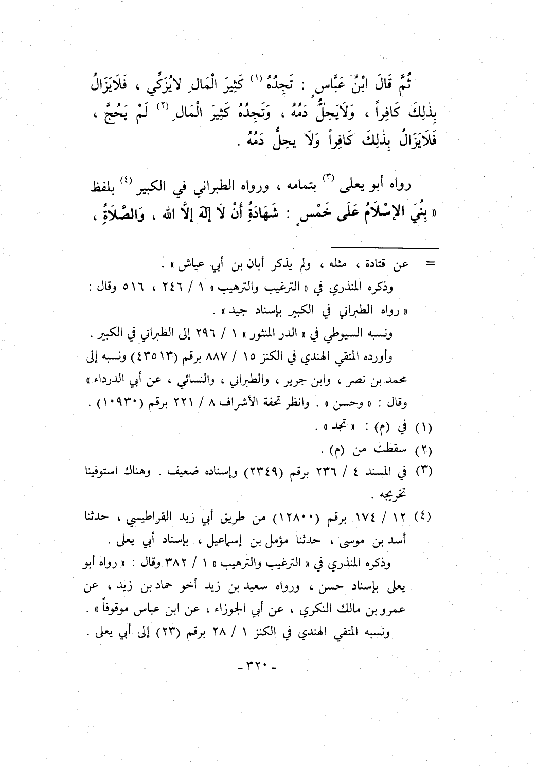 ثُمَّ قَالَ ابْنُ عَبَّاس: تَجِدُهُ (¬1) كَثِيرَ الْمَالِ لا يُزَكِّي، فَلاَ يَزَالُ بِذَلِكَ كَافِراً، وَلاَ يَحِلُّ دَمُهُ، وَتَجِدُهُ كَثِيرَ الْمَالِ (¬2) لَمْ يَحُجَّ، فَلاَ يَزَالُ بِذلِكَ كَافِراً وَلاَ يحِلُّ دَمُهُ.