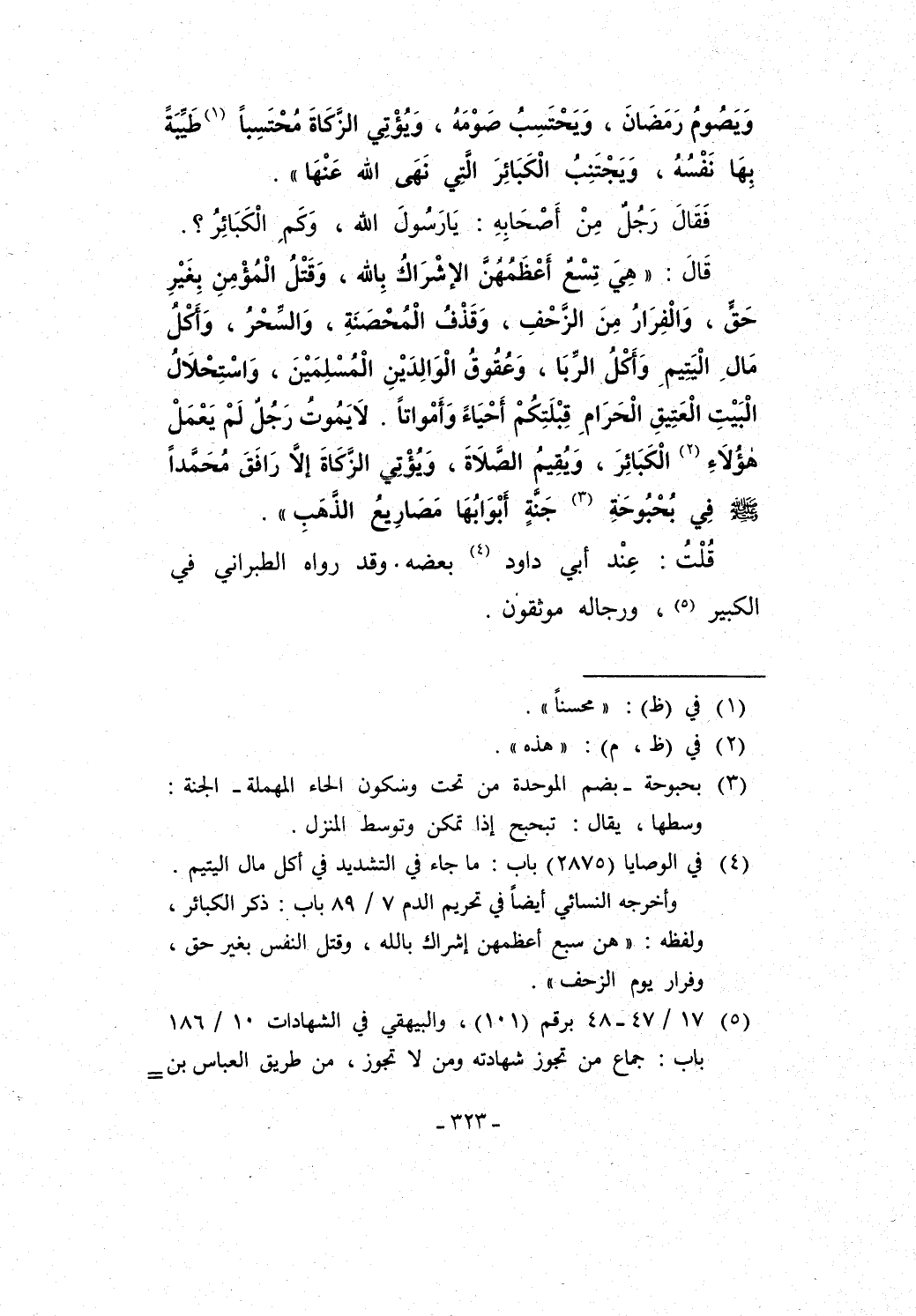 قَالَ: "هِيَ تِسْعٌ أَعْظَمُهُنَّ الإشرَاكُ بِالله، وَقَتْلُ الْمُؤْمِنِ بِغَيْرِ حَقَّ، وَالْفِرَارُ مِنَ الزَّحْفِ، وَقَذْفُ الْمُحْصَنَةِ، وَالسِّحْرُ، وَأَكْلُ مَالِ الْيَتِيمِ وَأَكْلُ الرِّبَا، وَعُقُوقُ الْوَالِدَيْنِ الْمُسْلِمَيْنَ، وَاسْتِحْلاَلُ الْبَيْتِ الْعَتِيقِ الْحَرَامِ قِبْلَتِكُمْ أَحْيَاءً وَأَمْواتاً. لاَ يَمُوتُ رَجُل لَمْ يَعْمَلْ هؤُلاَءِ (¬2) الْكَبَائِرَ، وَيُقِيمُ الصَّلاَةَ، وَيُؤتِ الزَّكَاةَ إلاَّ رَافَقَ مُحَمَّداً - صلى الله عليه وسلم - في بُحْبُوحَةِ (¬3) جَنَّةٍ أَبْوَابُهَا مَصَارِيعُ الذَّهَبِ".