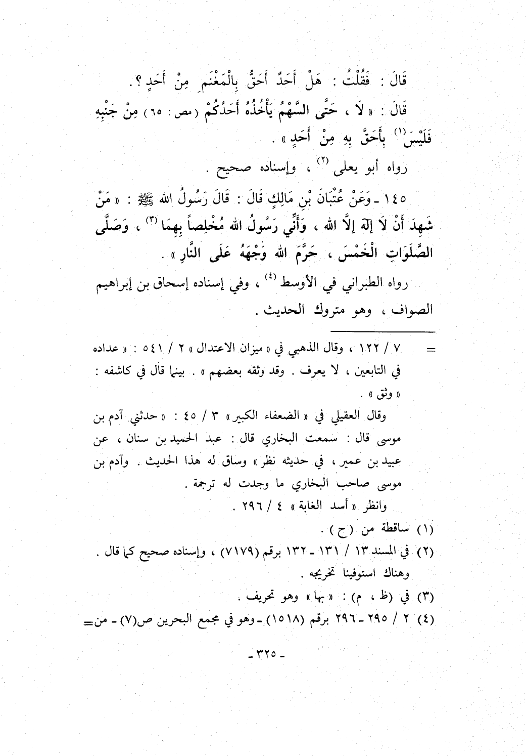 145 - وَعَنْ عُتْبَانَ بْنِ مَالِكٍ قَالَ: قَالَ رَسُولُ الله - صلى الله عليه وسلم -: "مَنْ شَهِدَ أَنْ لاَ إلَه إلاَّ الله، وَأَنِّي رَسُولُ الله مُخْلِصاً بِهِمَا (¬3)، وَصَلَّى الصَّلَوَاتِ الْخَمْسَ، حَرَّمَ الله وَجْهَهُ عَلَى النَّارِ".