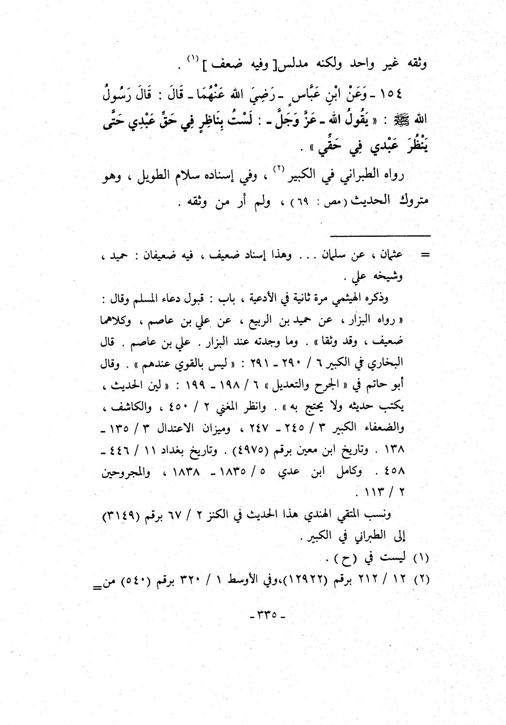 154 - وَعَنْ ابْنِ عَبَّاسٍ -رَضِيَ الله عَنْهُمَا- قَالَ: قَالَ رَسُولُ الله - صلى الله عليه وسلم -: "يَقُولُ اللهُ -عَزَّ وَجَل-: لَسْتُ بِنَاظِرٍ في حَقِّ عَبْدِي حَتَّى يَنْظُرَ عَبْدي في حَقِّي".
