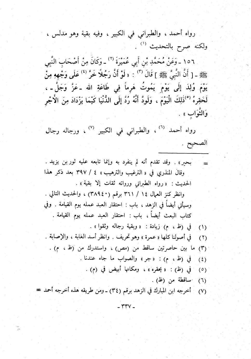 156 - وَعَنْ مُحَمَّدِ بْنِ أَبِي عُمَيْرَةَ (¬2) -وَكَانَ مِنْ أَصْحَابِ النَّبِي صلى الله عليه وسلم-[أَنَّ النَّبِيَّ - صلى الله عليه وسلم -] قَالَ (¬3): "لَوْ أَنَّ رَجُلاً خَرَّ (¬4) عَلَى وَجْهِهِ مِنْ يَوْمَ وُلِدَ إلَى يَوْمِ يَمُوتُ هَرِماً في طَاعَةِ الله -عَزَّ وَجَلَّ-، لَحَقِرهُ (¬5) ذَلِكَ الْيَوْمَ، وَلَودَّ أَنَّهُ رُدَّ إلَى الدُّنْيَا كيْمَا يَزْدَادَ مِنَ الأَجْرِ وَالثَّوَابِ".