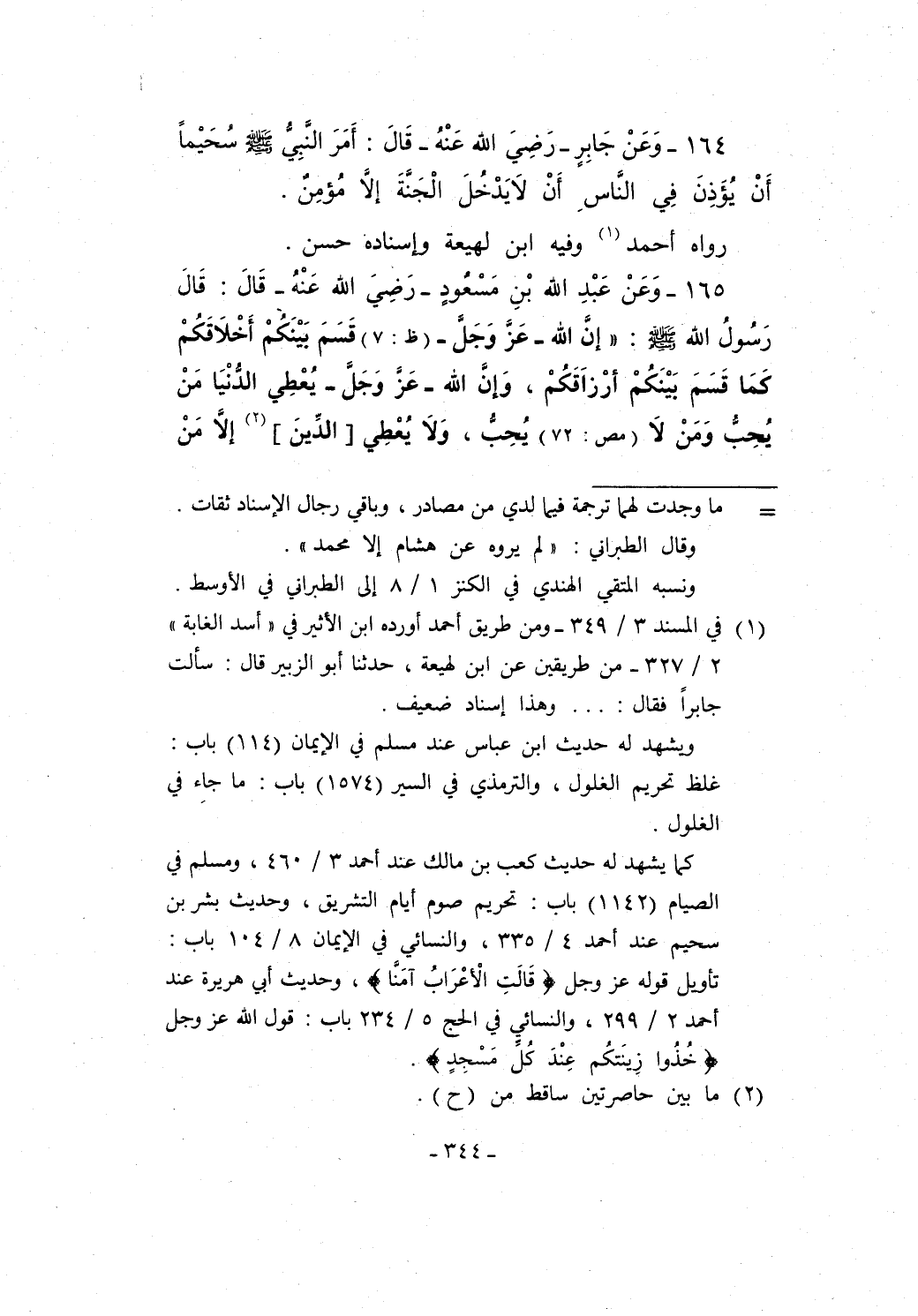 165 - وَعَنْ عَبْدِ الله بْنِ مَسْعُودٍ -رَضِيَ الله عَنْهُ- قَالَ: قَالَ رَسُولُ الله - صلى الله عليه وسلم -: "إنَّ الله -عَزَّ وَجَلُّ- (ظ: 7) قَسَمَ بَيْنَكُمْ أَخْلاَقَكُمْ كَمَا قَسَمَ بَيْنَكُمْ أرْزاقَكُمْ، وَإن الله -عَزَّ وَجَلَّ- يُعْطِي الدُّنْيَا مَنْ يُحِبُّ وَمَنْ لاَ (مص: 72) يُحِبُّ، وَلاَ يُعْطِي [الدِّينَ] (¬2) إلاَّ مَنْ
