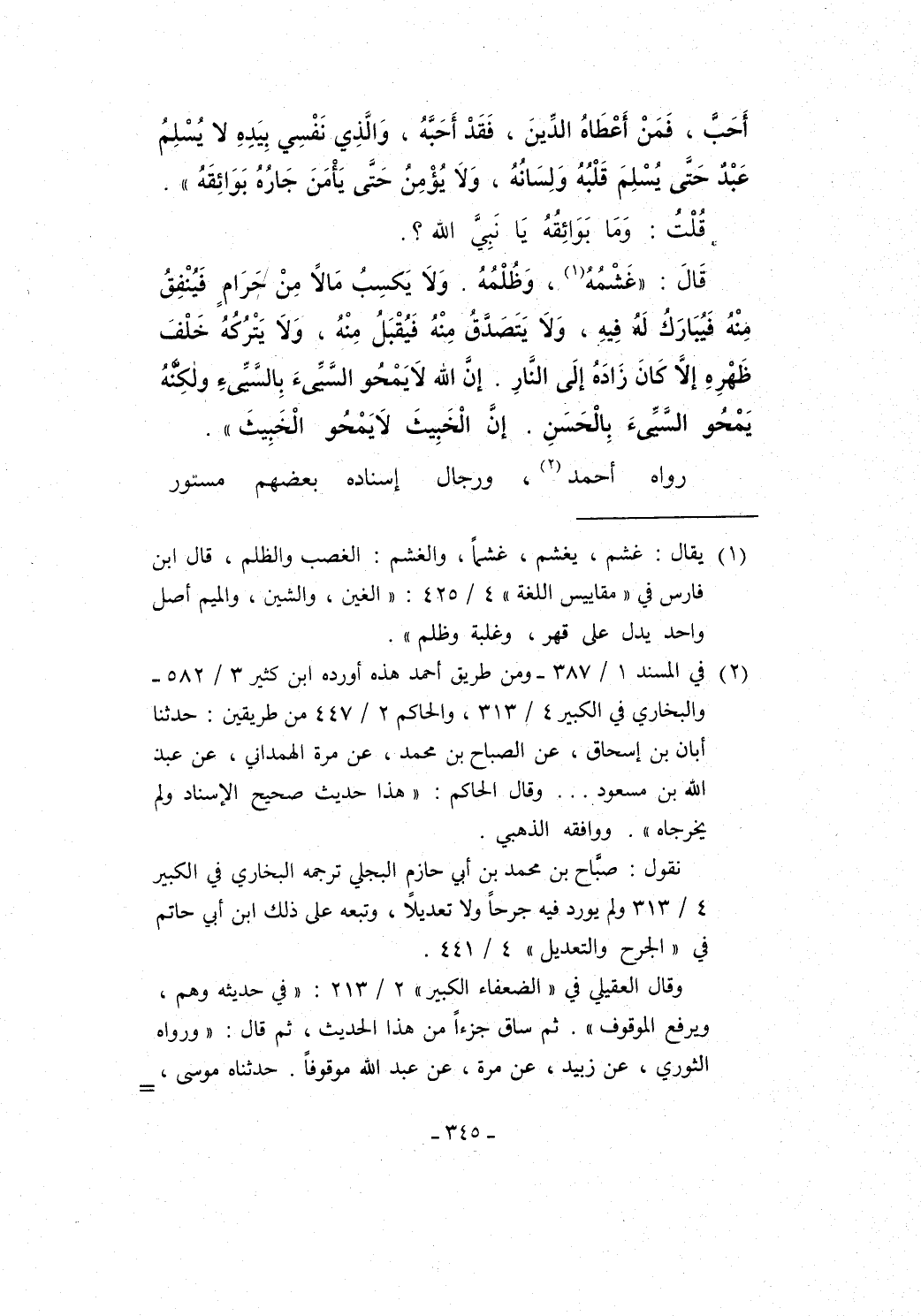 أَحَبَّ، فَمَنْ أَعْطَاهُ الدِّينَ، فَقَدْ أَحَبَّهُ، وَالَّذِي نَفْسِي بِيَدِهِ لا يُسْلِمُ عَبْدٌ حَتَّى يُسْلِمَ قَلْبُهُ وَلِسَانُهُ، وَلاَ يُؤْمِن حَتَّى يَأْمَنَ جَارُهُ بَوَائِقَهُ".