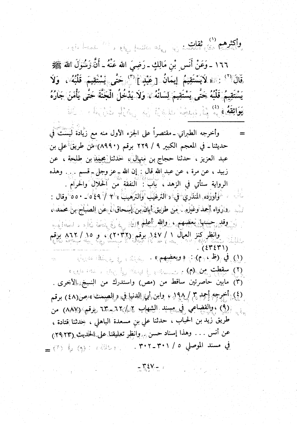 166 - وَعَنْ أَنَسِ بْنِ مَالِكٍ - رَضِيَ اللهُ عَنْهُ- أَنَّ رَسُولَ اللهِ صَلَّى اللَّهُ عَلَيْهِ وَسَلَّمَ قَالَ (¬2): "لَا يَسْتَقِيمُ إِيمَانُ [عَبْدٍ] (¬3) حَتَّى يَسْتَقِيمَ قَلْبُهُ، وَلَا يَسْتَقِيمُ قَلْبُهُ حَتَّى يَسْتَقِيمَ لِسَانُهُ، وَلاَ يَدْخُلُ الجَنَّةَ حَتَّى يَأْمَنَ جَارُهُ بَوَائِقَهُ" (¬4).