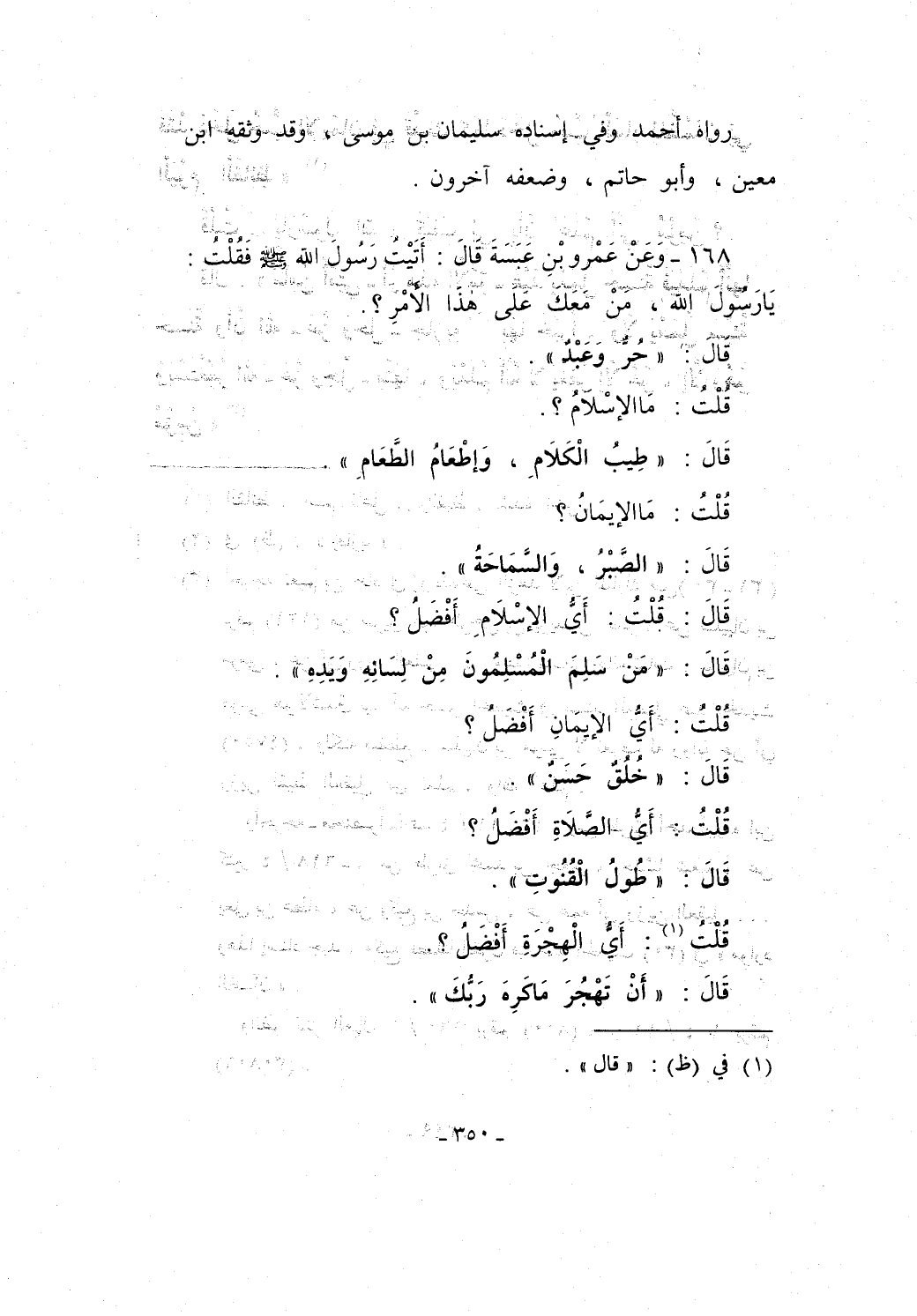 168 - وَعَنْ عَمْرِو بْنِ عَبَسَةَ قَالَ: أَتَيْتُ رَسُولَ اللَّهِ - صَلَّى اللَّهُ عَلَيْهِ وَسَلَّمَ - فَقُلْتُ: يَا رَسُولَ اللَّهِ، مَنْ مَعَكَ عَلَى هَذَا الْأَمْرِ؟