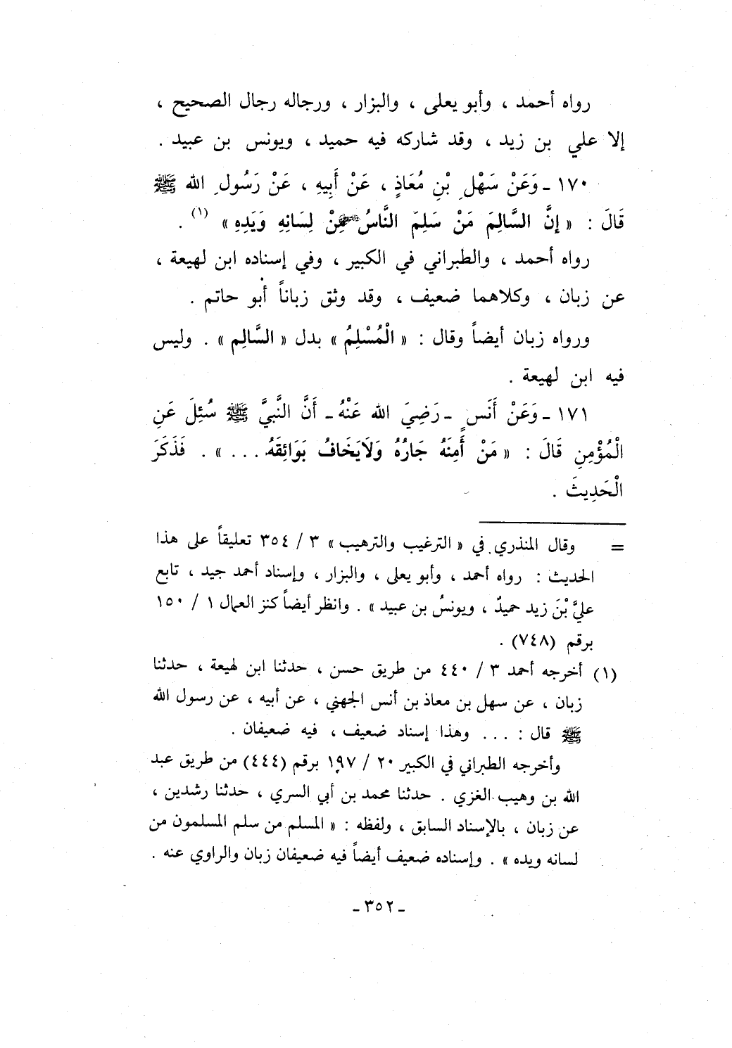 170 - وَعَنْ سَهْلِ بْنِ مُعَاذٍ، عَنْ أَبِيهِ، عَنْ رَسُولِ الله - صلى الله عليه وسلم - قَالَ: "إن السَّالِمَ مَنْ سَلِمَ النَّاسُ من لِسَانِهِ وَيَدِهِ" (¬1).