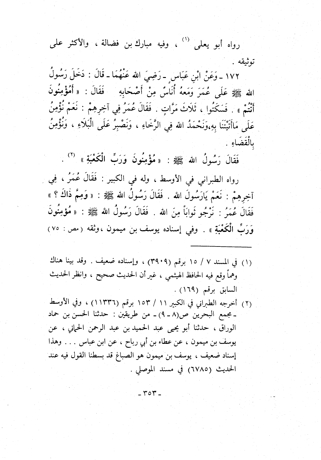 172 - وَعَنْ ابْنِ عَبَاسٍ -رَضِيَ الله عَنْهُمَا- قَالَ: دَخَلَ رَسُولُ الله - صلى الله عليه وسلم - عَلَى عُمَرَ وَمَعَهُ أُنَاسٌ مِنْ أَصْحَابِهِ فَقَالَ: "أَمُؤْمِنُونَ أَنْتُمْ". فَسَكَتُوا، ثَلاَثَ مَرَّاتٍ. فَقَالَ عُمَرُ في آخِرِهِمْ: نَعَمْ نُؤْمِنُ عَلَى مَا أَتَيْتَنَا بِهِ، وَنَحْمَدُ الله في الرَّخَاءِ، وَنَصْبِرُ عَلَى الْبَلاَءِ، وَنُؤْمِنُ بِالْقَضَاءِ.