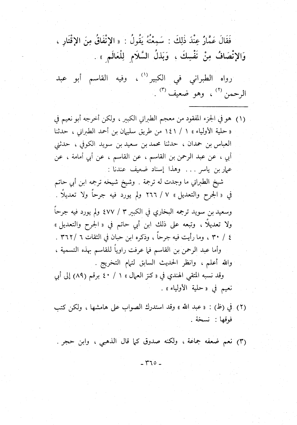 فَقَالَ عَمَّارٌ عِنْدَ ذلِكَ: سَمِعْتُهُ يَقُولُ: "الإنْفَاقُ مِنَ الإقْتَارِ، وَالإنْصَافُ مِنْ نَفْسِكَ، وَبَذْلُ السَّلاَمِ لِلْعَالَمِ".