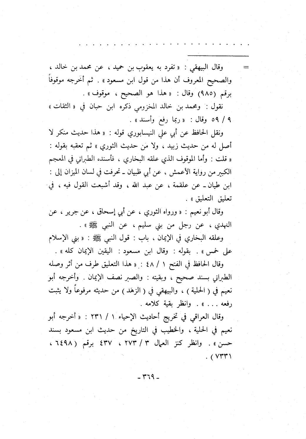 ونقل الحافظ عن أبي علي النيسابوري قوله: "هذا حديث منكر لا أصل له من حديث زبيد، ولا من حديث الثوري" ثم تعقبه بقوله: "قلت: وأما الموقوف الذي علقه البخاري، فأسند الطبراني في المعجم الكبير من رواية الأعمش، عن أبي ظبيان -تحرفت في لسان الميزان إلى: ابن طيان- عن علقمة، عن عبد الله، وقد أشبعت القول فيه، في تعليق التعليق".