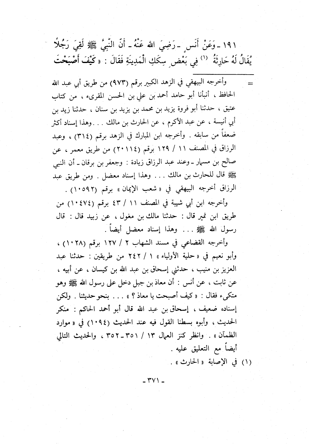 191 - وَعَنْ أَنَسٍ -رَضِيَ الله عَنْهُ- أَنّ النبِيَّ - صلى الله عليه وسلم - لقِيَ رَجلاً يُقَالُ لَهُ حَارِثَةُ (¬1) في بَعْضِ سِكَكِ الْمَدِينَةِ فَقَالَ: "كيْفَ أَصْبَحْتَ