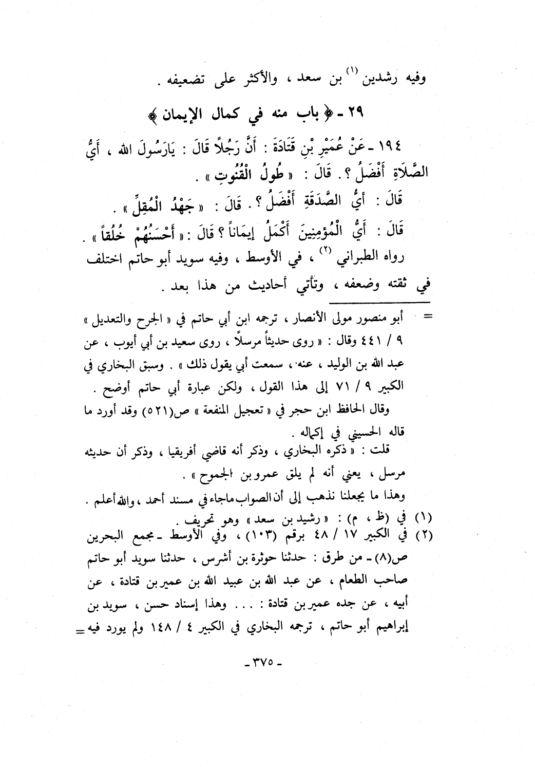 194 - عَنْ عُمَيْرِ بْنِ قَتَادَةَ: أَنَّ رَجُلاً قَالَ: يَا رَسُولَ الله، أَيُّ الصَّلاَةِ أَفْضَلُ؟. قَالَ: "طُولُ الْقُنُوتِ".