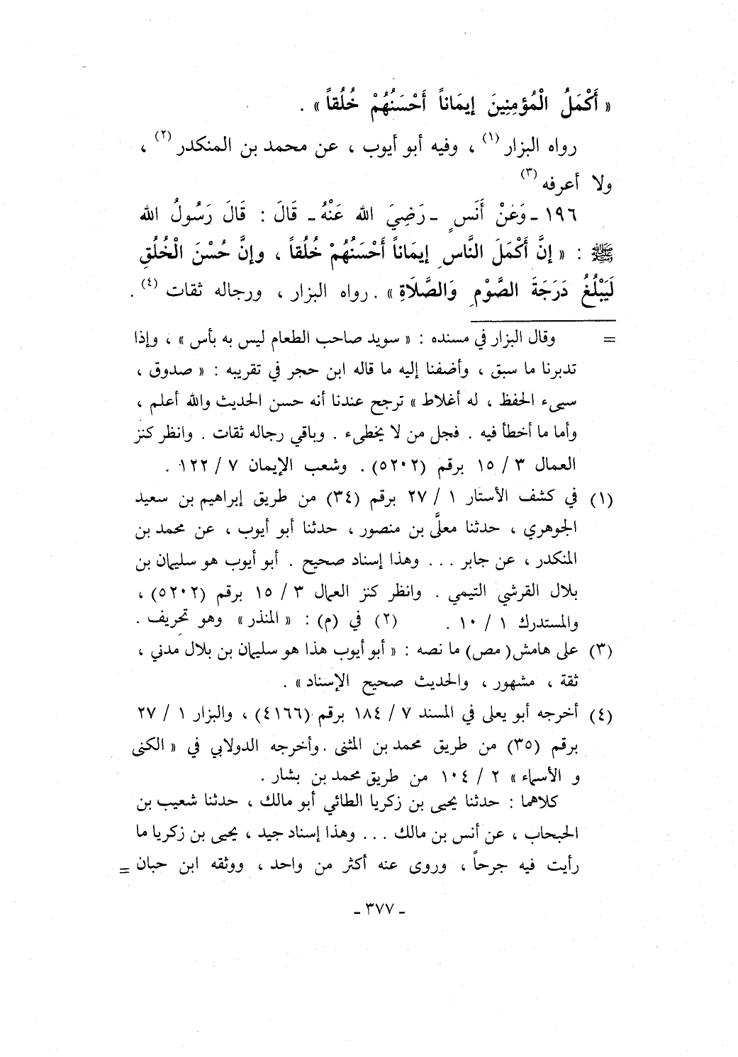 196 - وَعَنْ أَنَسٍ -رَضِيَ الله عَنْهُ- قَالَ: قَالَ رَسُولُ الله - صلى الله عليه وسلم -: "إنَّ أَكَمَلَ النَّاسِ إيمَانًا أَحْسَنُهُمْ خُلُقاً، وإنَّ حُسْنَ الْخُلُقِ لَيَبْلُغُ دَرَجَةَ الصَّوْمِ وَالصَّلاَةِ". رواه البزار، ورجاله ثقات (¬4).